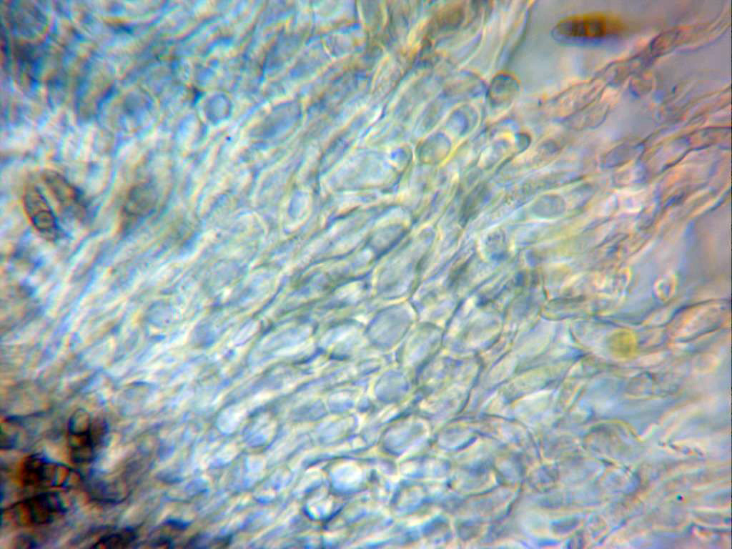 Excípulo a 1000 aumentos, con hifas de formas redondeadas, con una capa amarillenta en la parte exterior y con unas hifas más alargadas a modo de rudimentarios pelos que se pueden observar en la parte superior derecha de la imágen.
