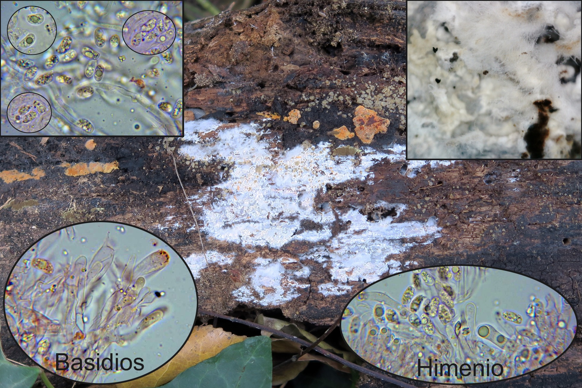 . Con terminaciones estériles de formas redondeadas en el himenio, basidios tetraspóricos con fíbulas presentes en la base de los mismos y con las esporas en muchos casos agrupadas dentro de una masa amorfa.