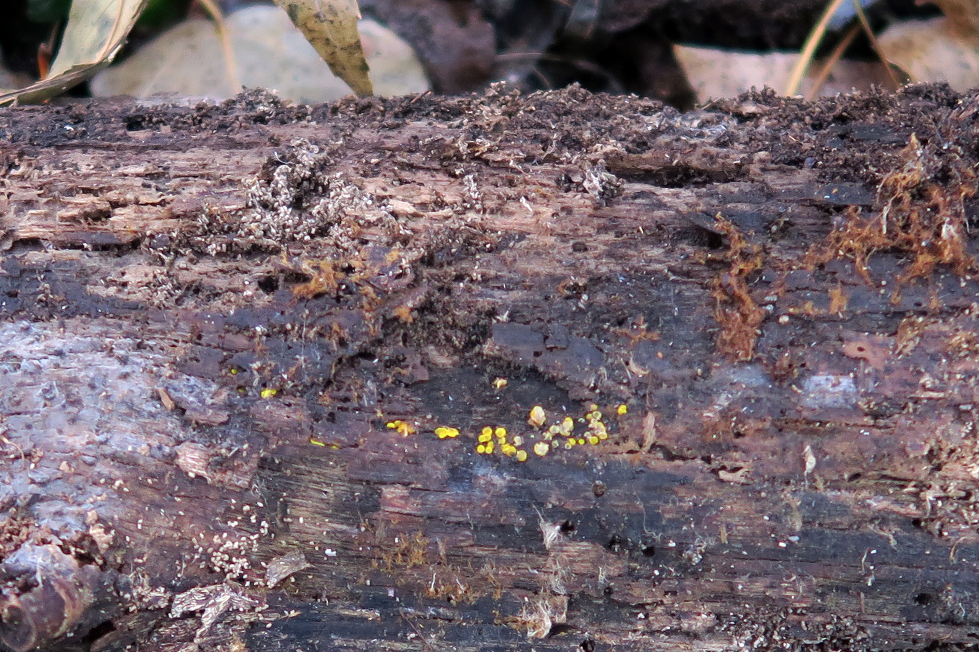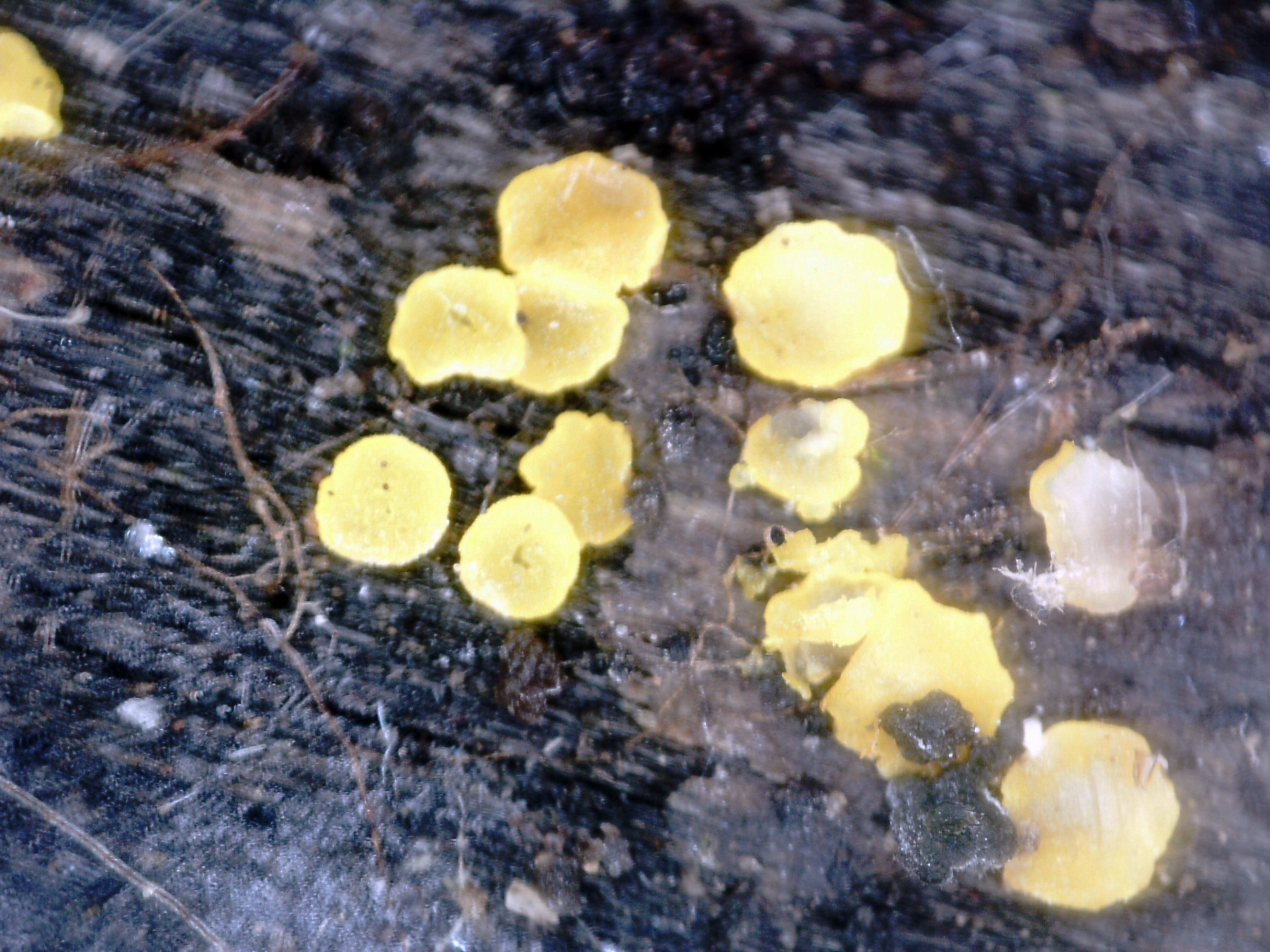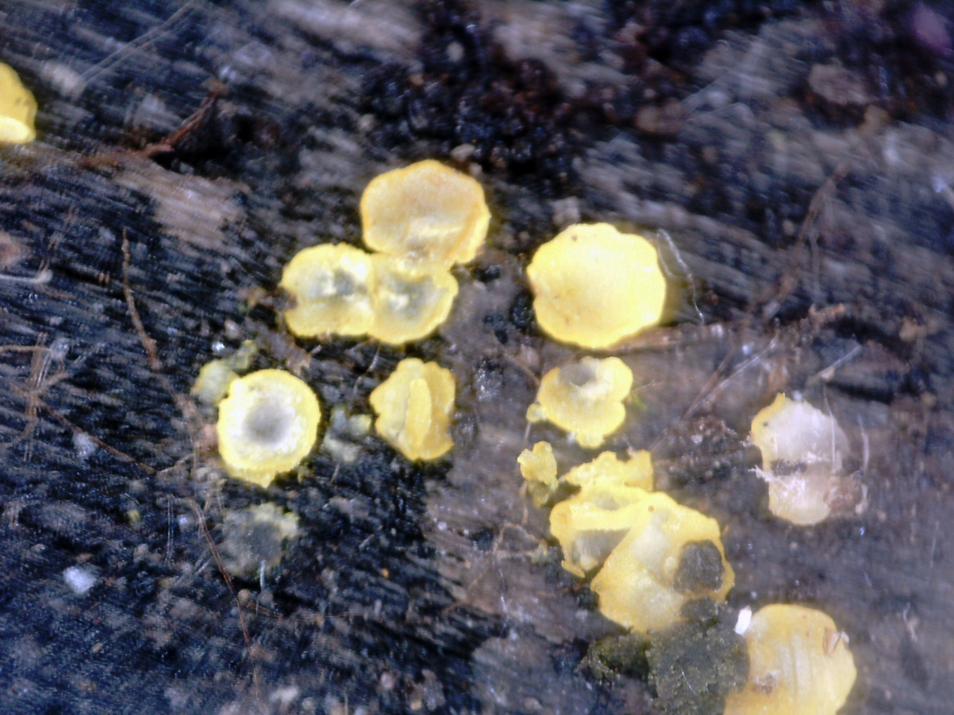Muy diminutos apotecios, sesiles o en todo caso con un muy diminuto y rudimentario pié, de color amarillo, en forma de copa abierta o plato, muy frágiles y de consistencia cérea.