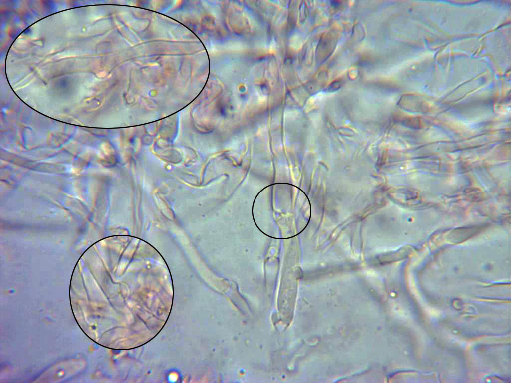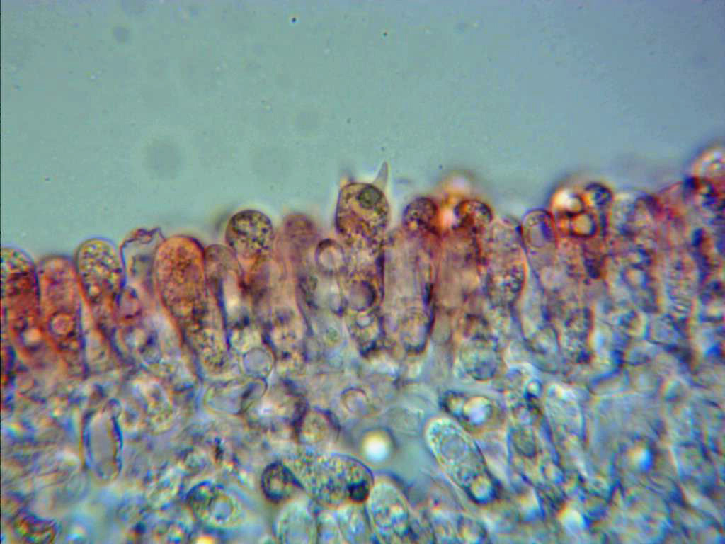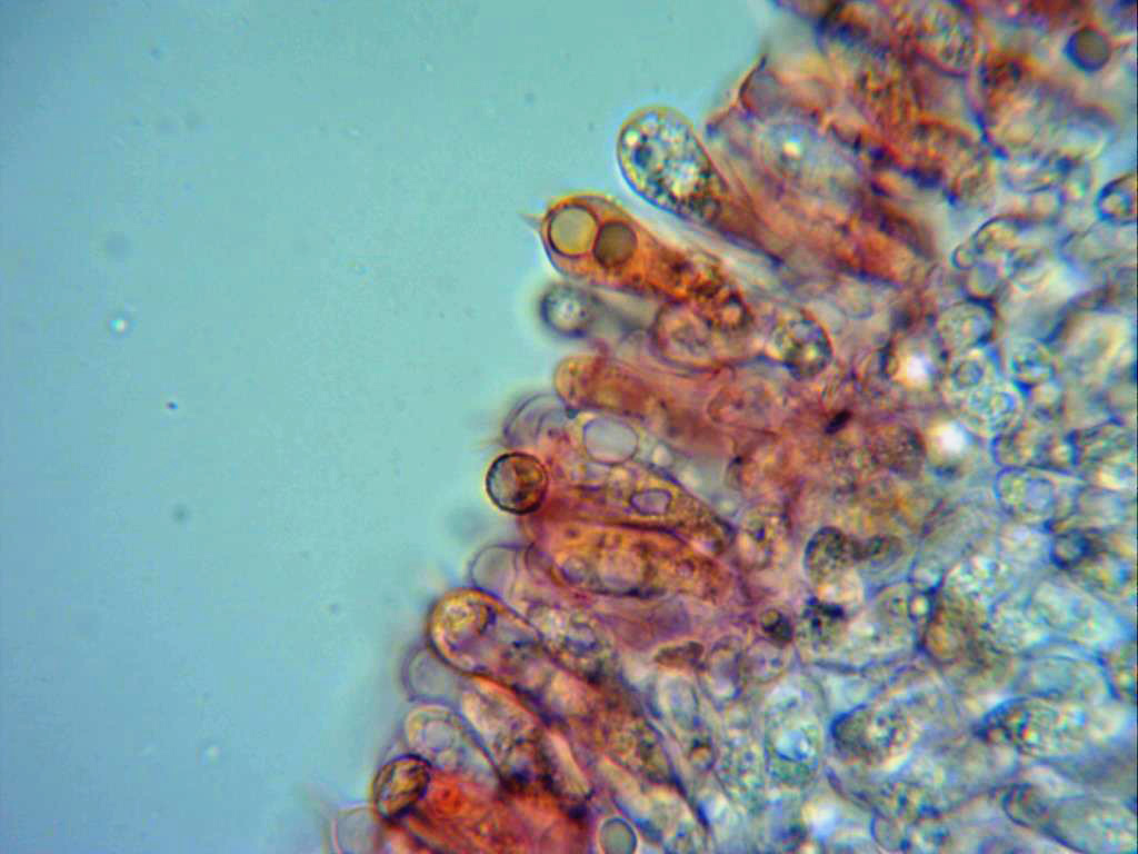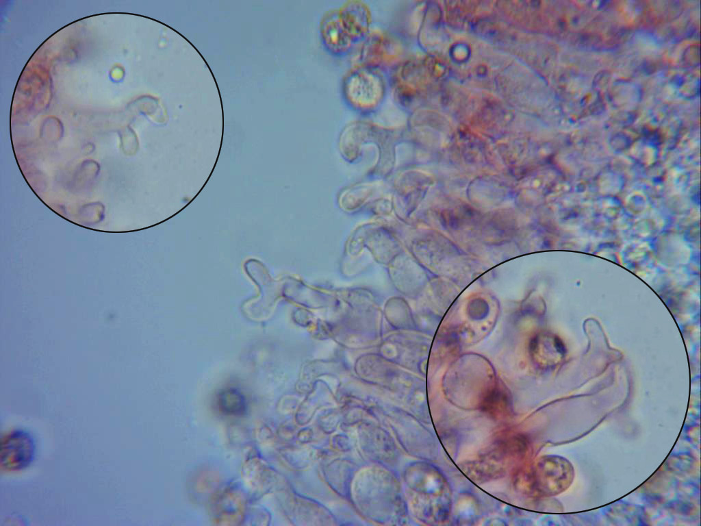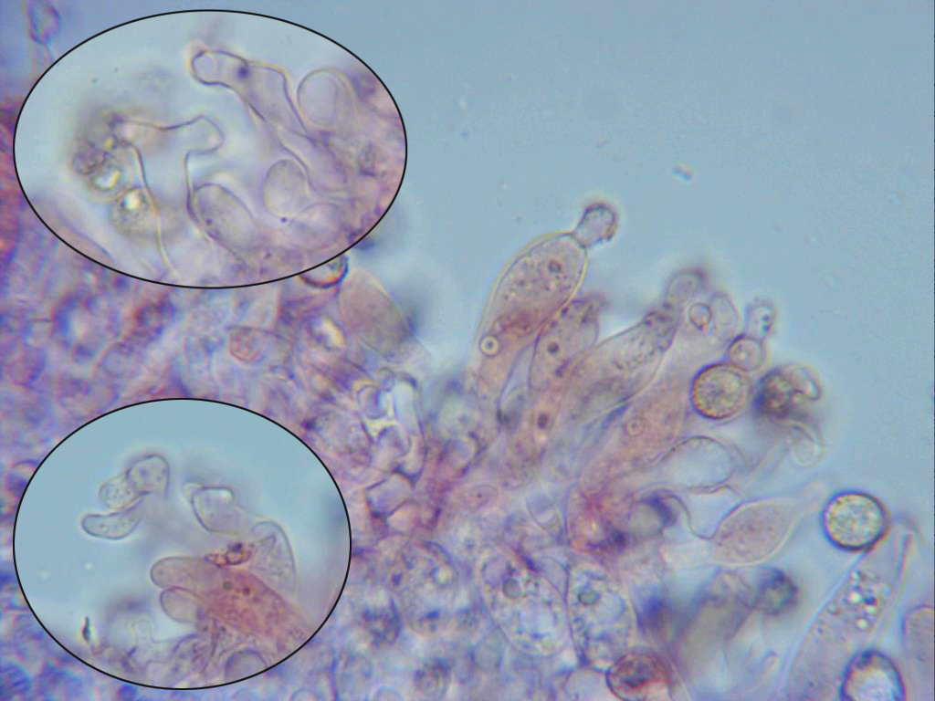 Sus típicos queilocistidios que la distinguen de sus posibles confusiones, abundantes, sinuosos y en muchos casos ramificados, detalle que he querido resaltar en las imágenes.