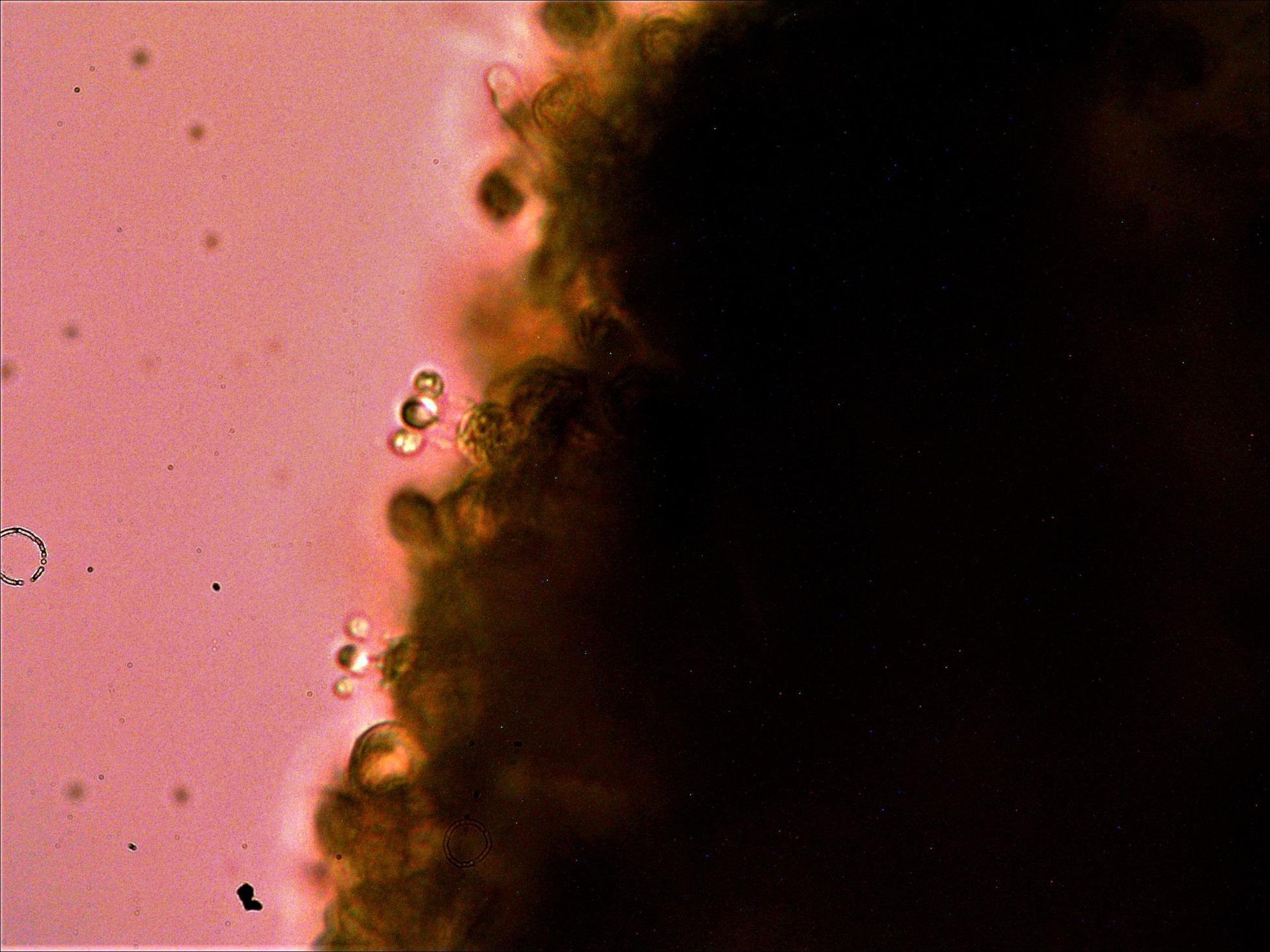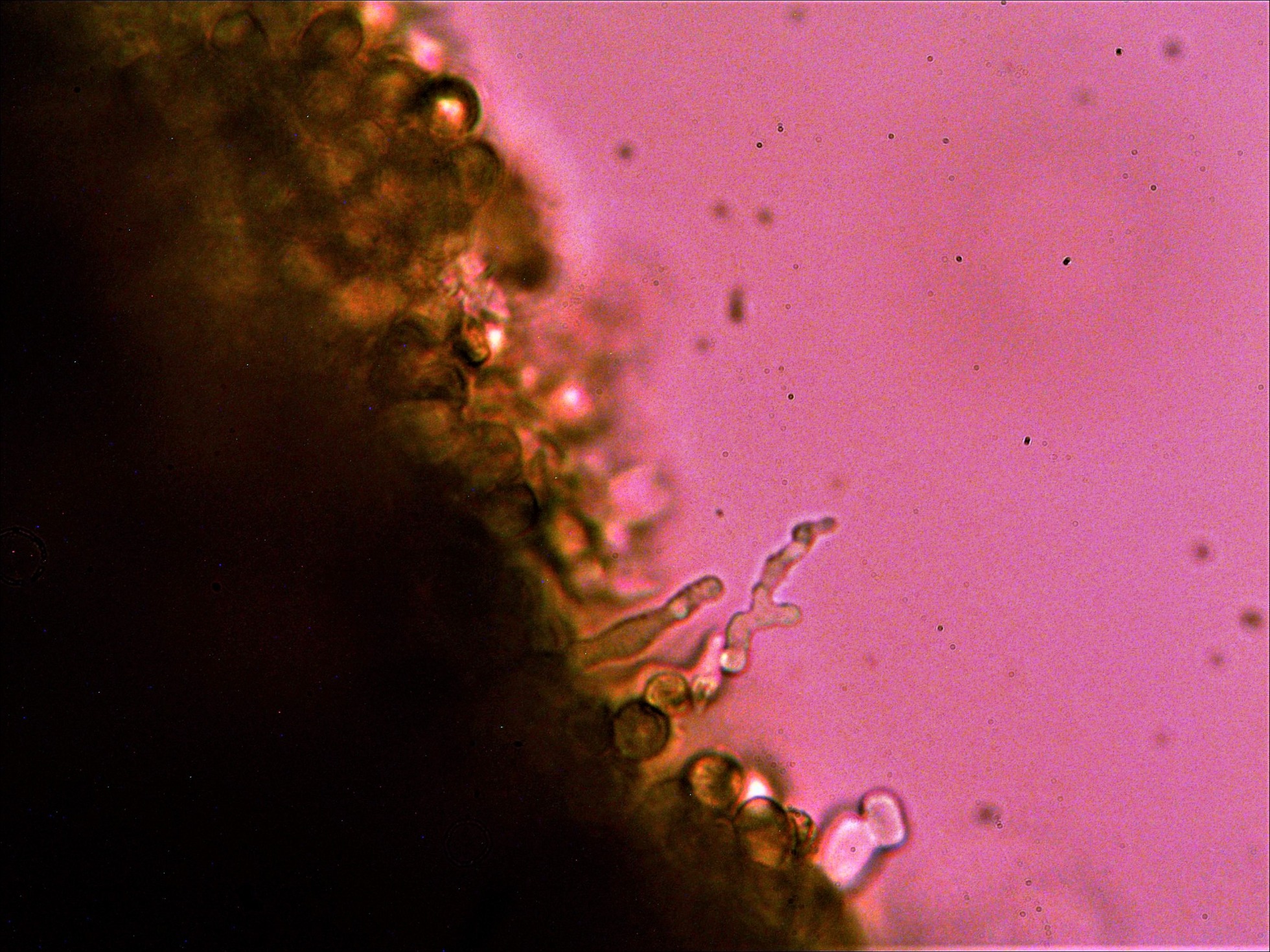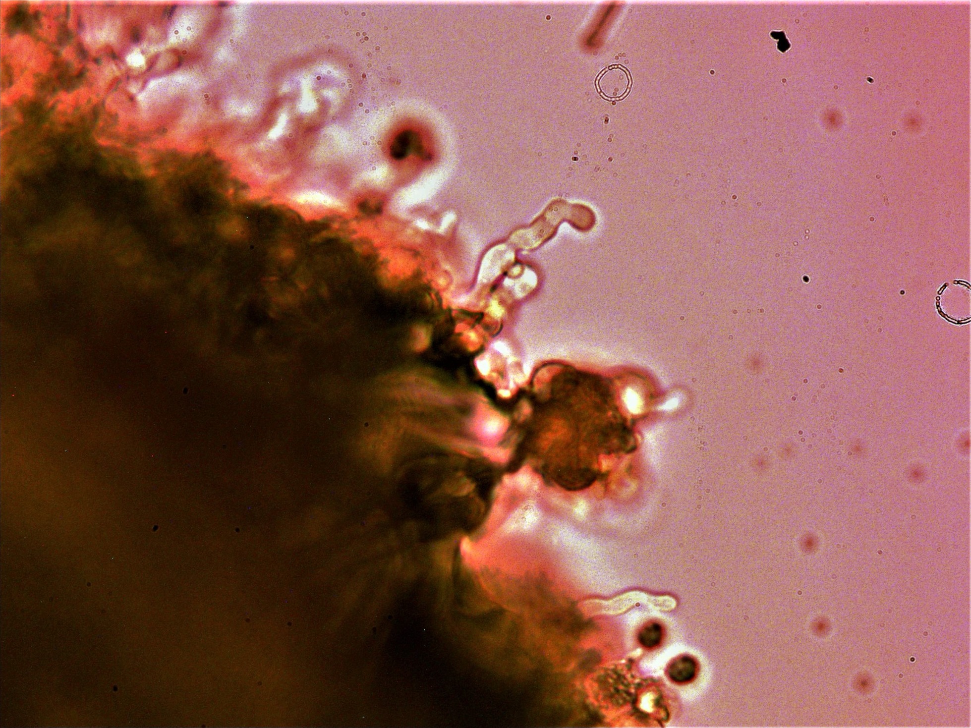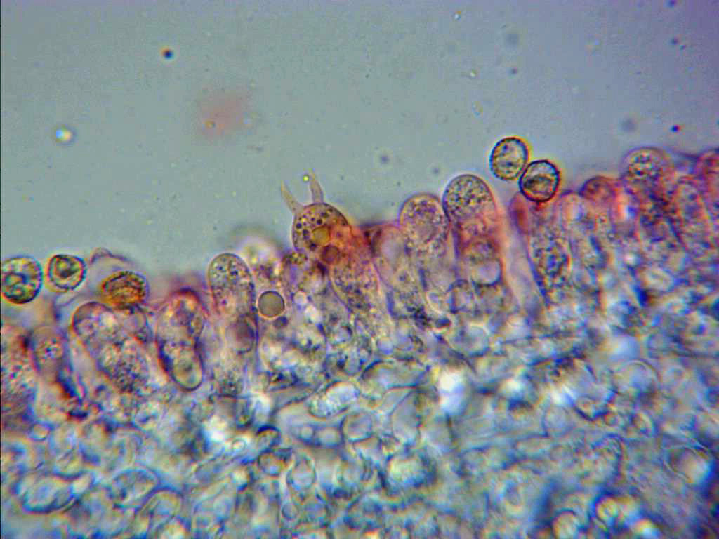 Sus típicos queilocistidios que la distinguen de sus posibles confusiones, abundantes, sinuosos y en muchos casos ramificados, detalle que he querido resaltar en las imágenes.