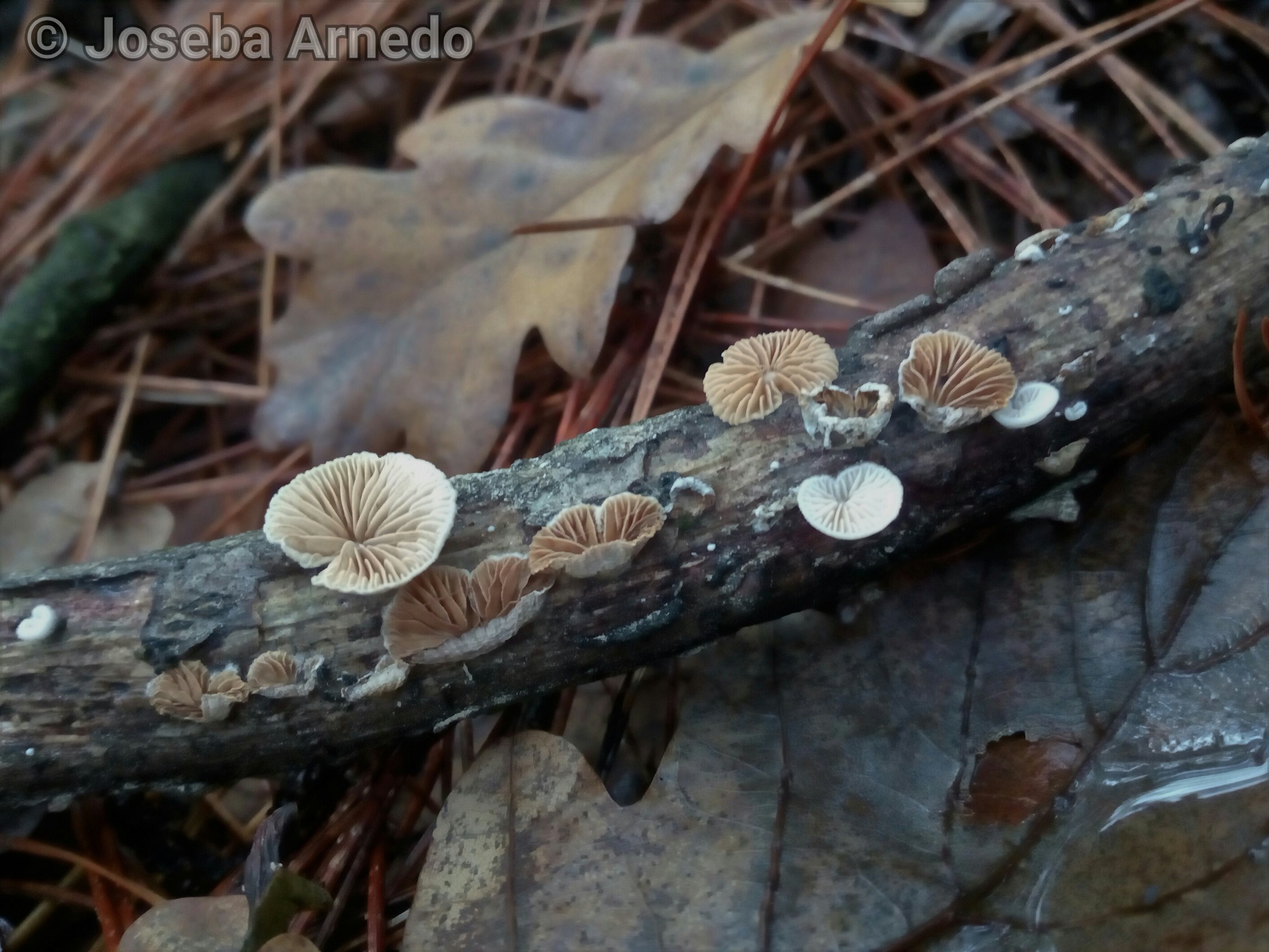 Crecía al borde de un pinar en una zona con pinos y robles y la pude ver en abundancia en todo tipo de ramas. La cogí pensando que se trataría de Crepidotus variabilis pero la micro ha dicho lo contrario, es la muy similar Crepidotus cesatii.