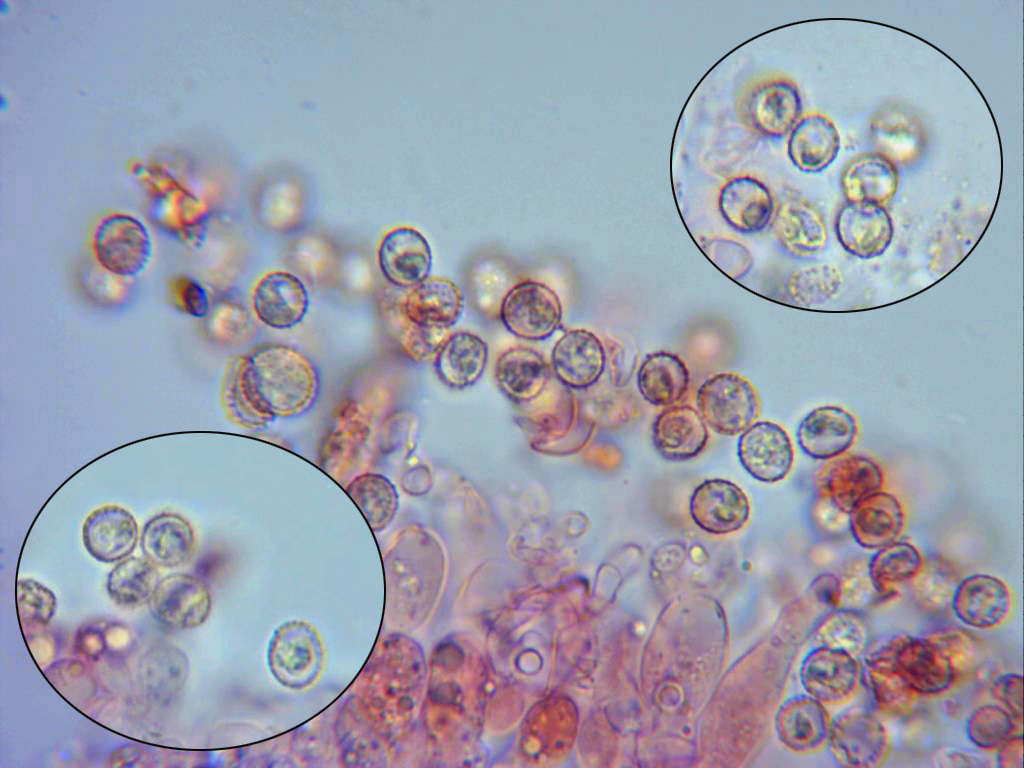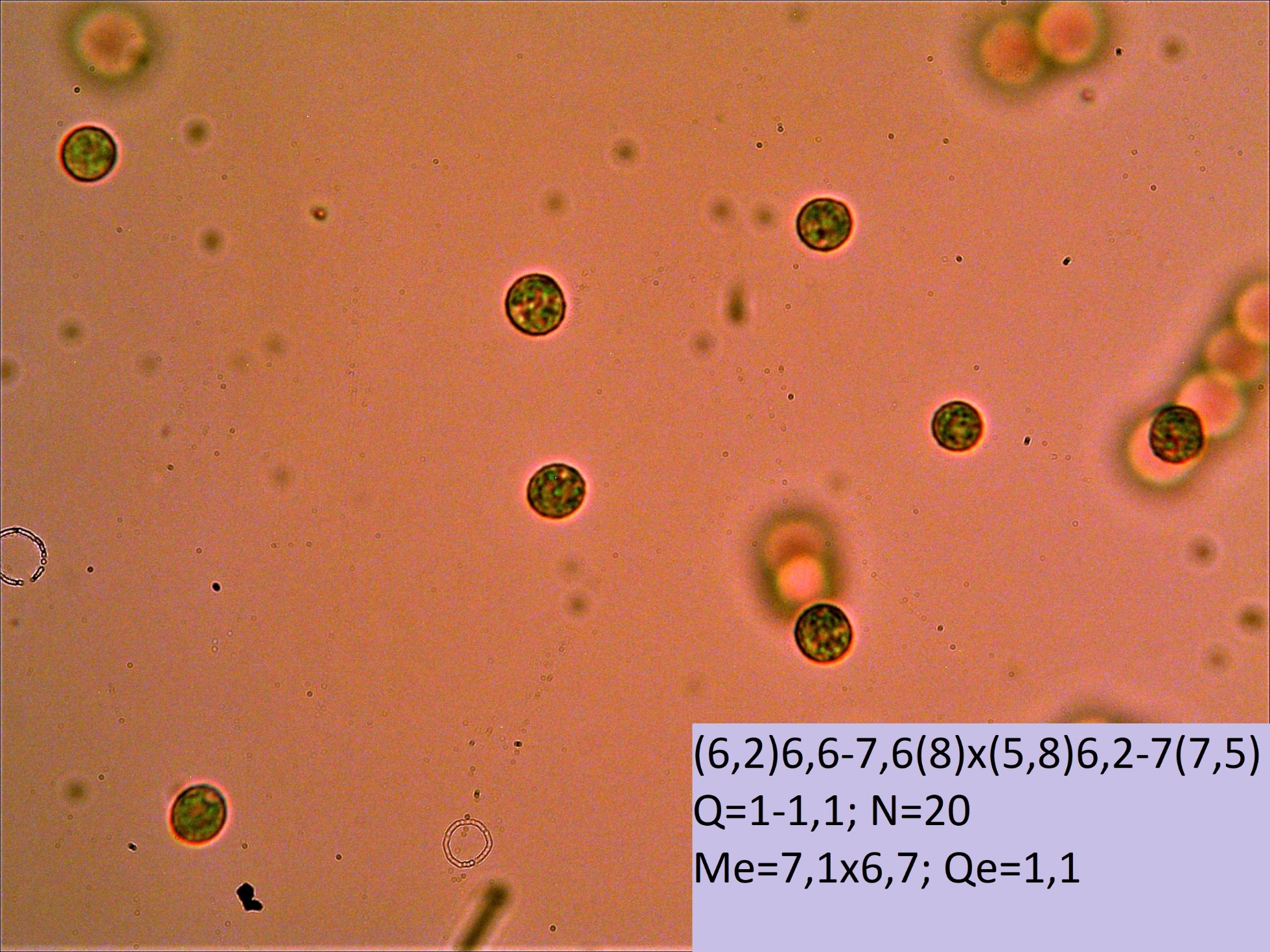 En mis mediciones de 5,6 (6,2;7,5) 7,6 x 5,4 (5,8;6,4) 6,9 micras, bastante acordes con las mediciones de Joseba, quizás un poco por debajo debido a las circunstancias, pero que de todos modos entran bien dentro de la variabilidad de la especie.