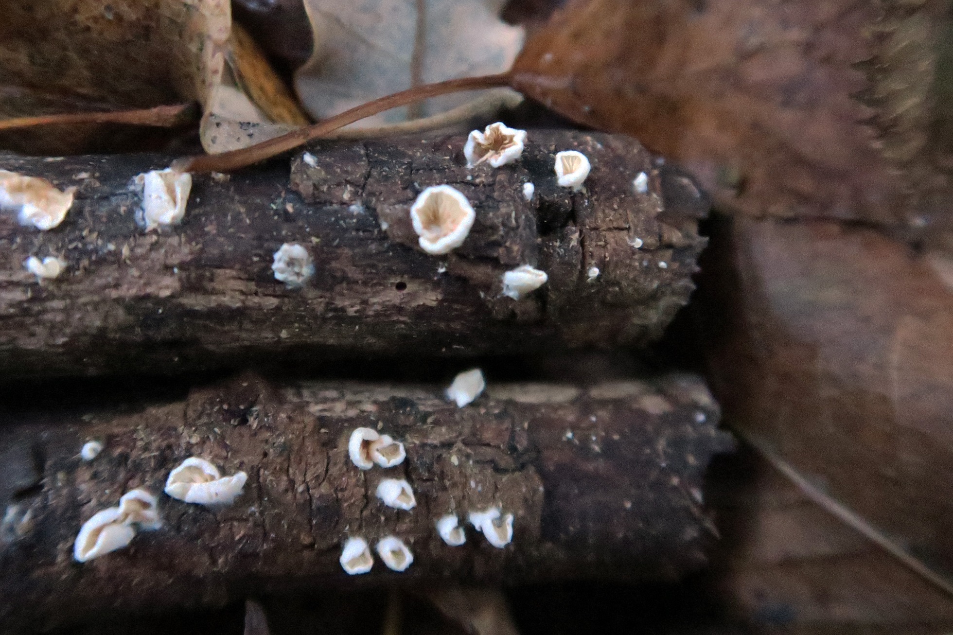 Unos pequeños apotecios, en un pequeño tronco de planifolio, bastante deteriorados por el efecto de la helada, pero que sirven bien para tachar el cromo.
