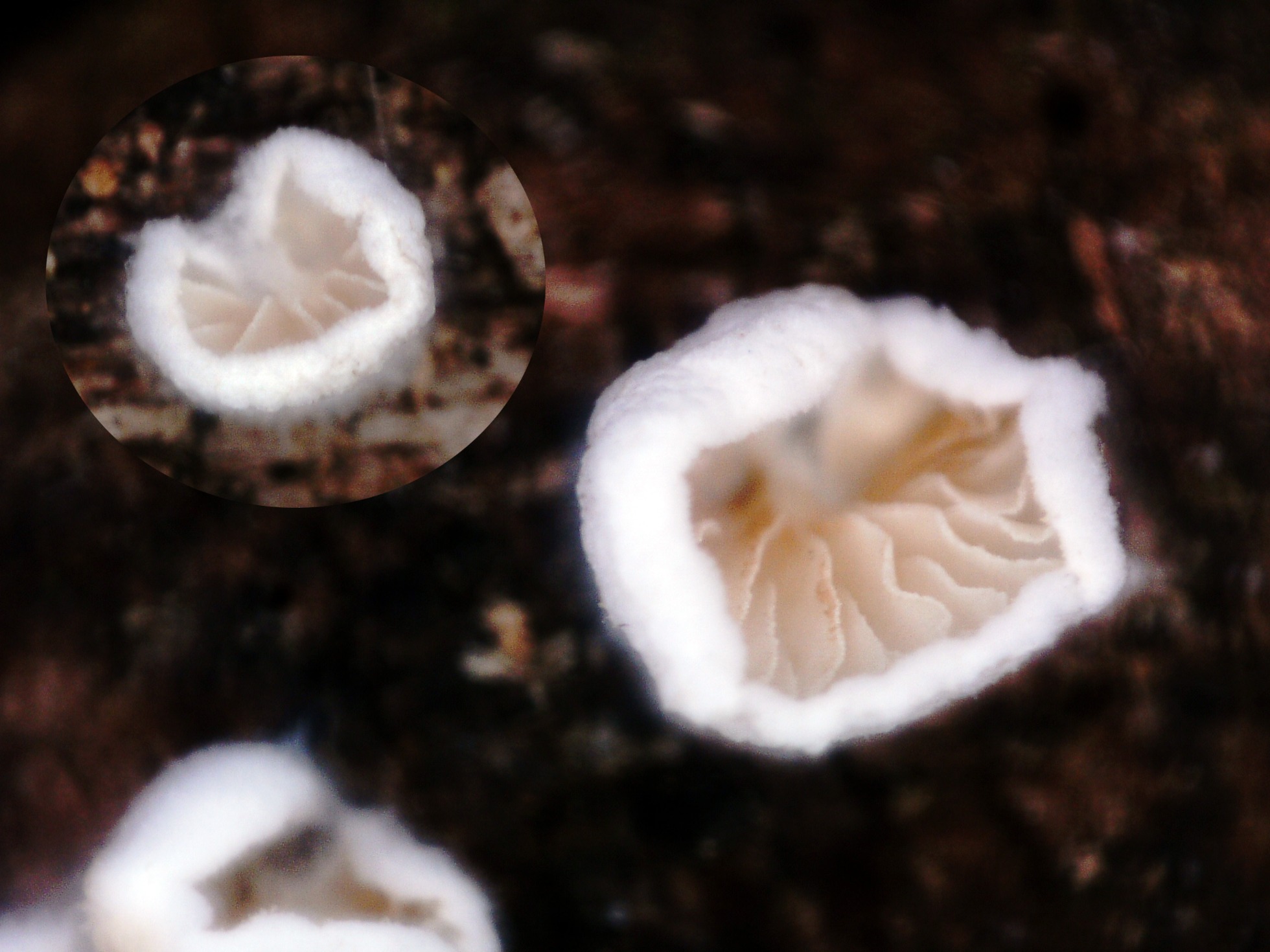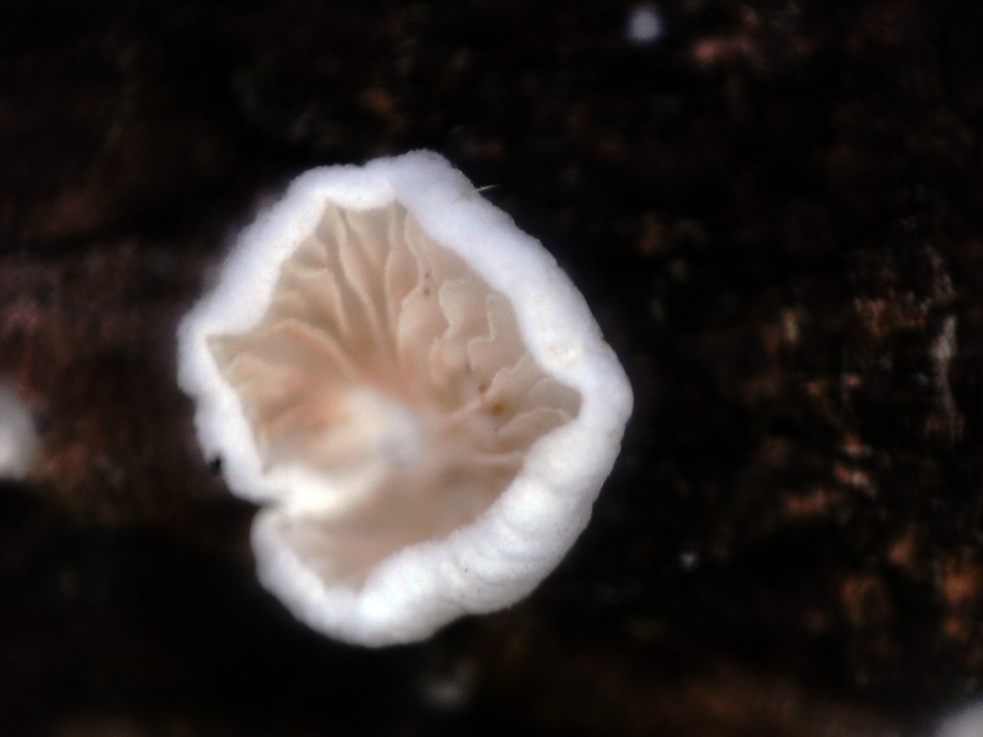 Especie en forma de abanico, sesil, de color blanco, con láminas pardas, espaciadas y con abundantes lamélulas.