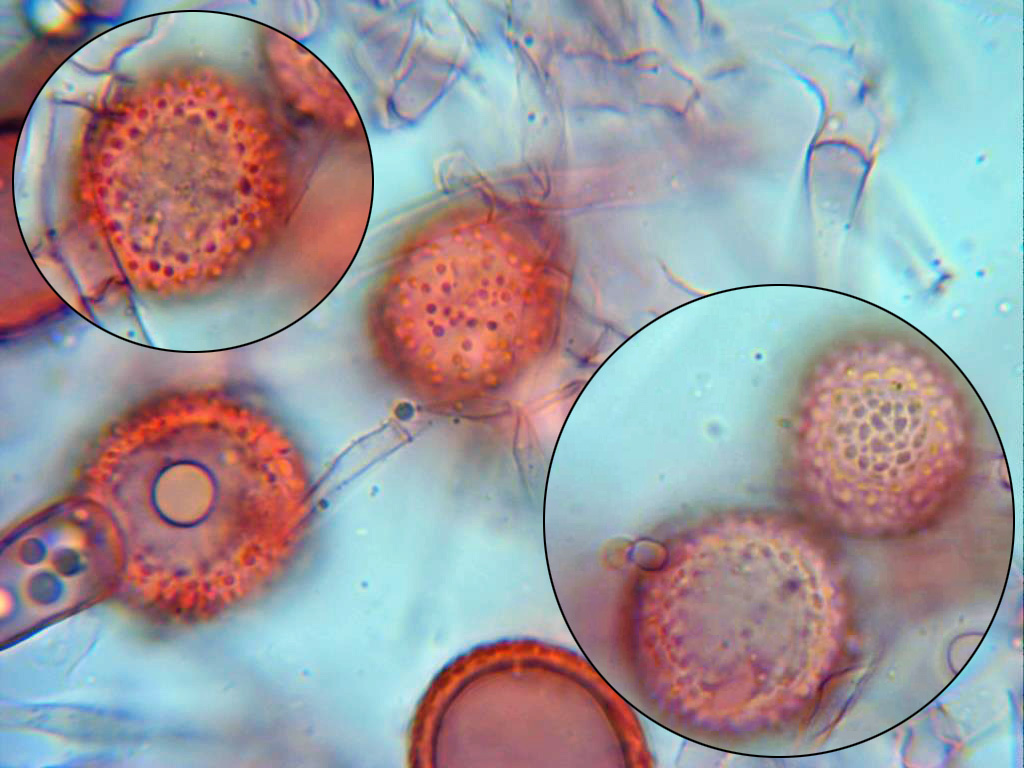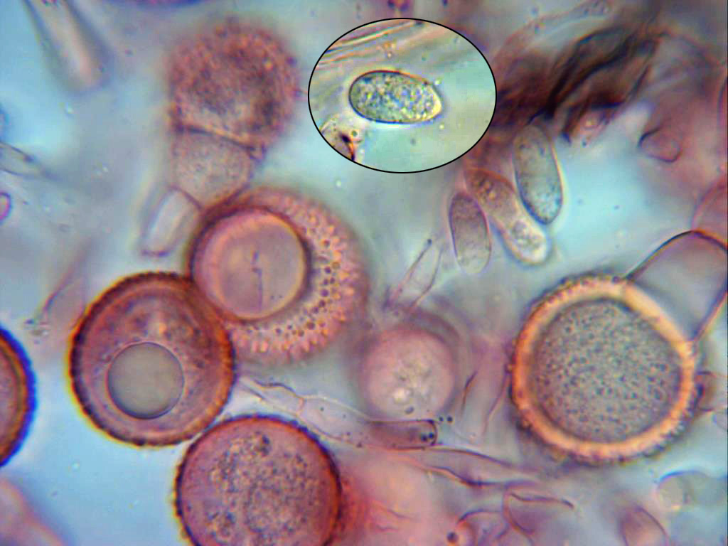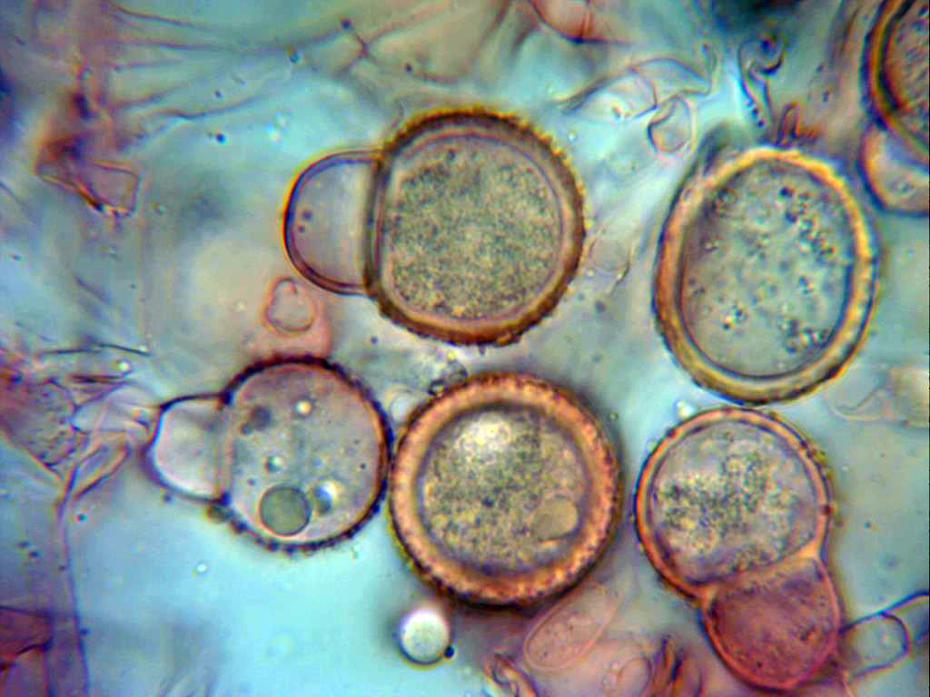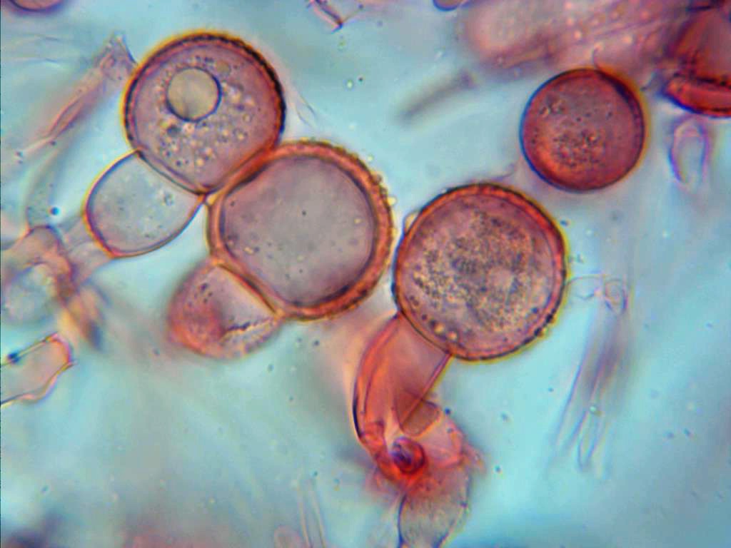Clamidosporas bicelulares, con una célula inferior lisa e hialina y una superior opaca, granulosa y espinosa, esta última en mis mediciones de entre 23 a 34 micras.