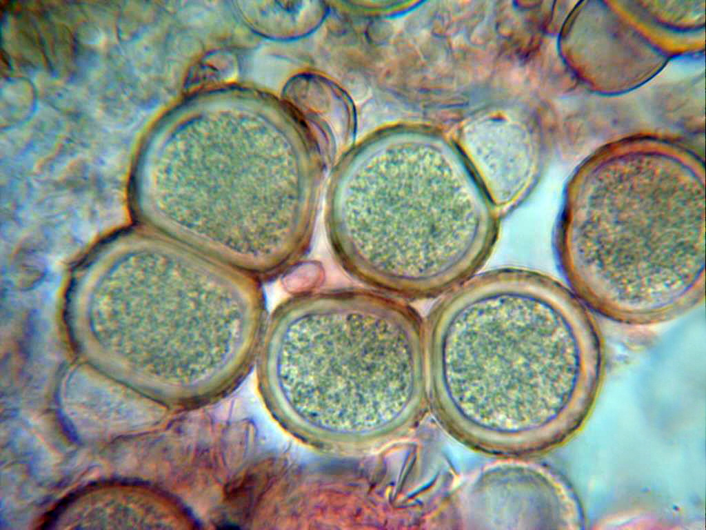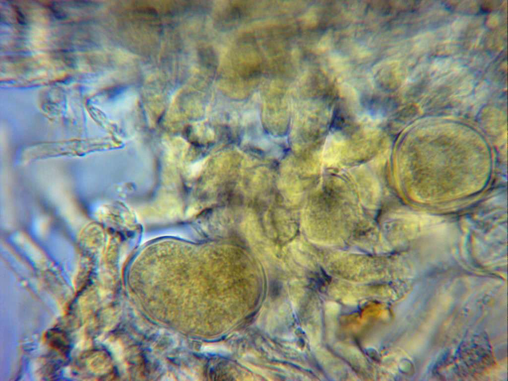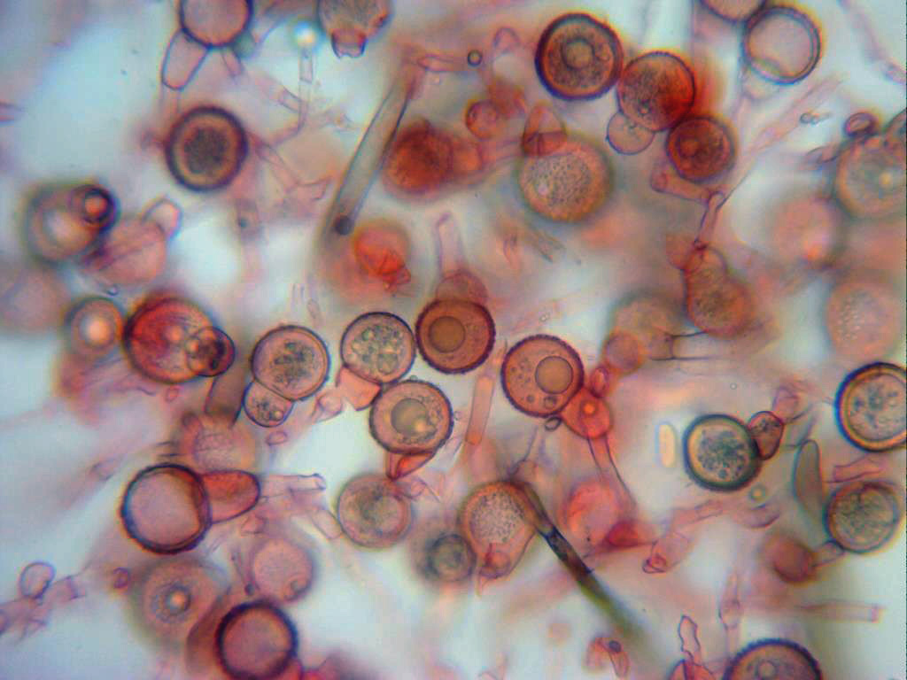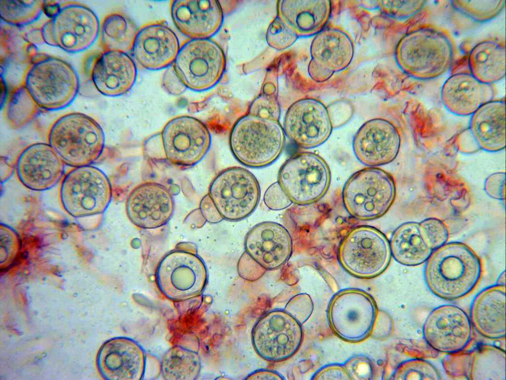 También presentes en las muestras unos conidios, los he reflejado en la parte superior derecha de la imágen, en este caso su tamaño de 14,1;15,1 X 6,8;8,7 micras.