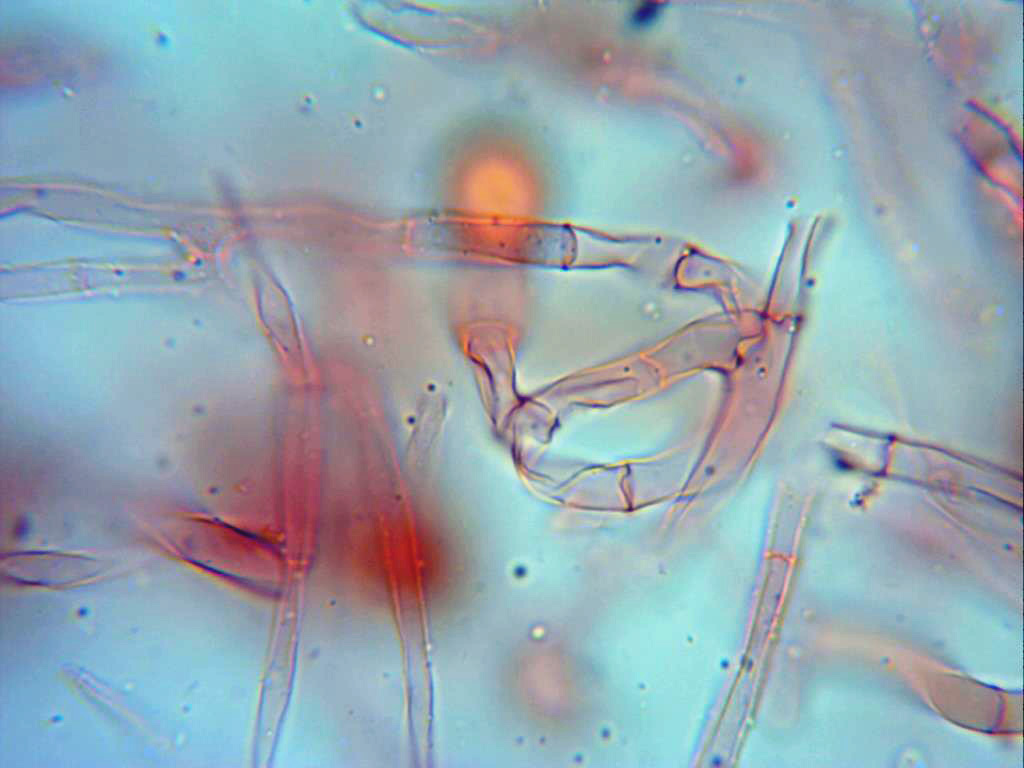 Hifas de los conidióforos, hialinas, multiseptadas, con septos irregulares y al parecer sin fíbulas.