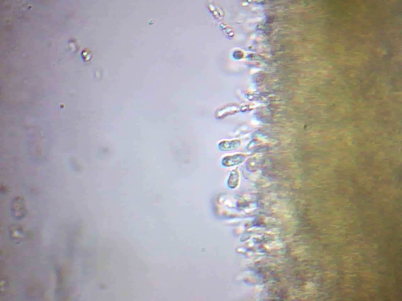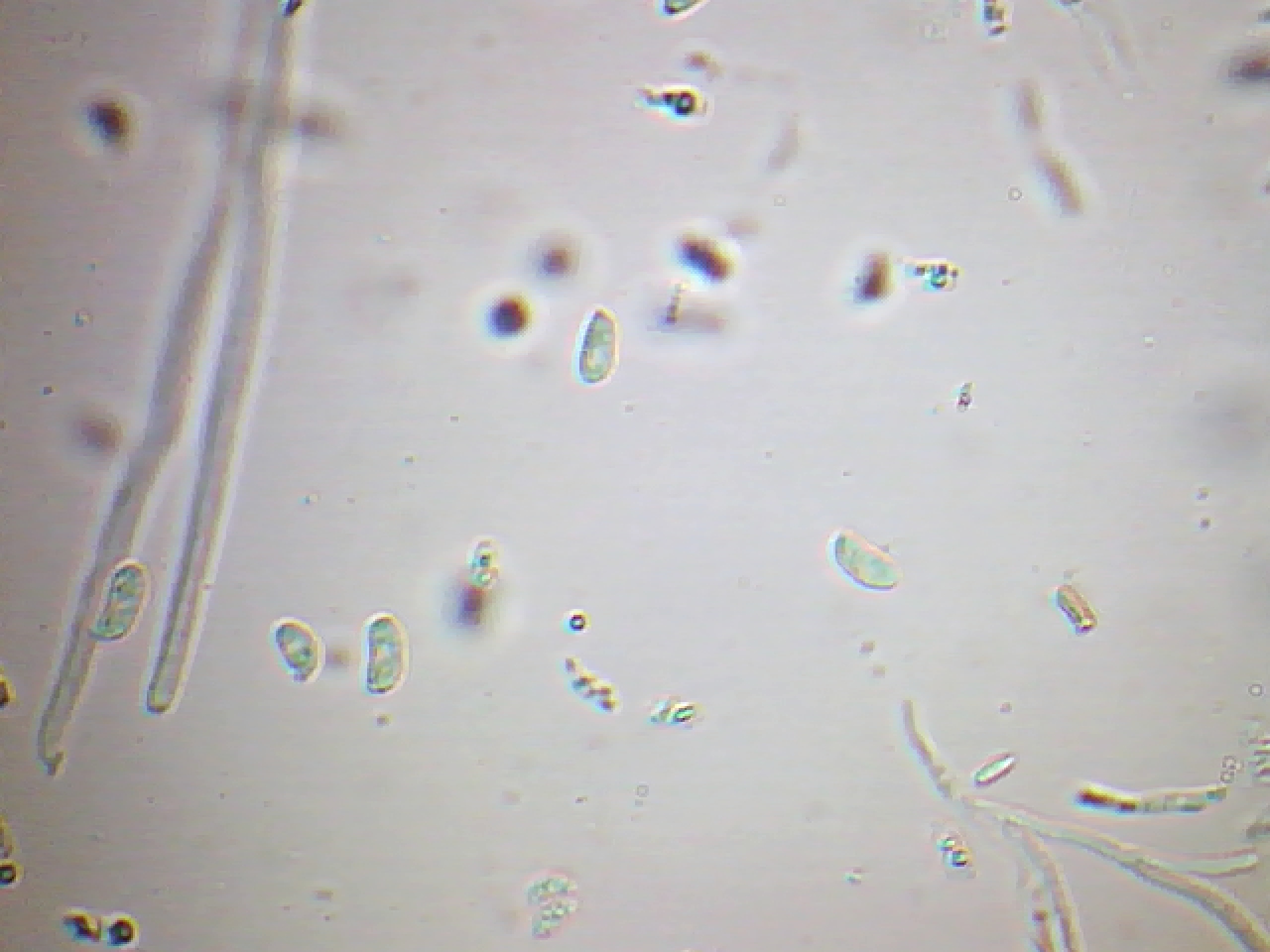 Te dejo una imágen mía de la Calocera cornea, en mi caso en mis mediciones las esporas de 7,7;9,9 X 4,1;4,7 micras.