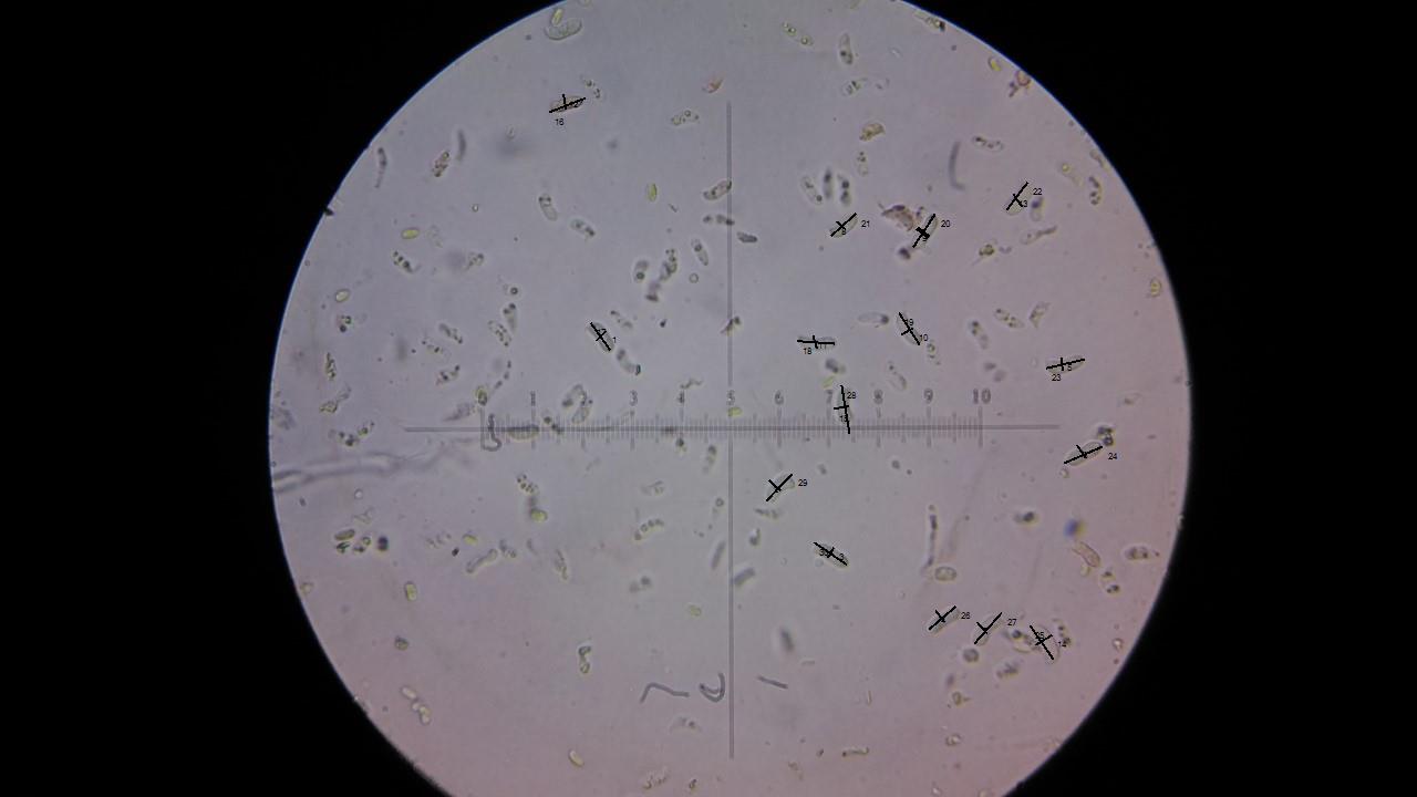 En tu imágen he podido observar claramente a 15 esporas que al parecer no están ladeadas y aptas para la medición.