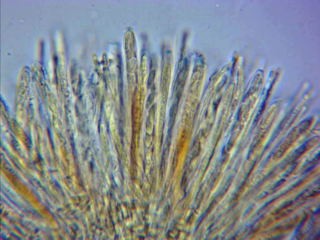 Paráfisis con contenido, filiformes y que no sobresalen por encima del límite de las ascas, y de tan solo 2,4 a 3,1 μm. de ancho.