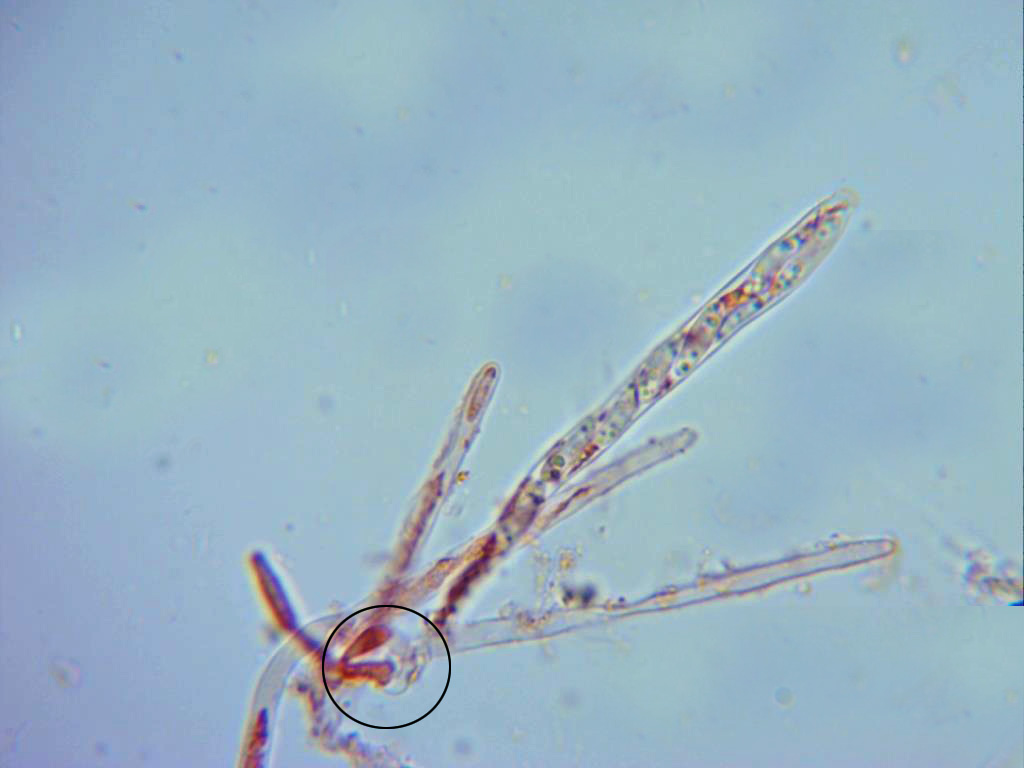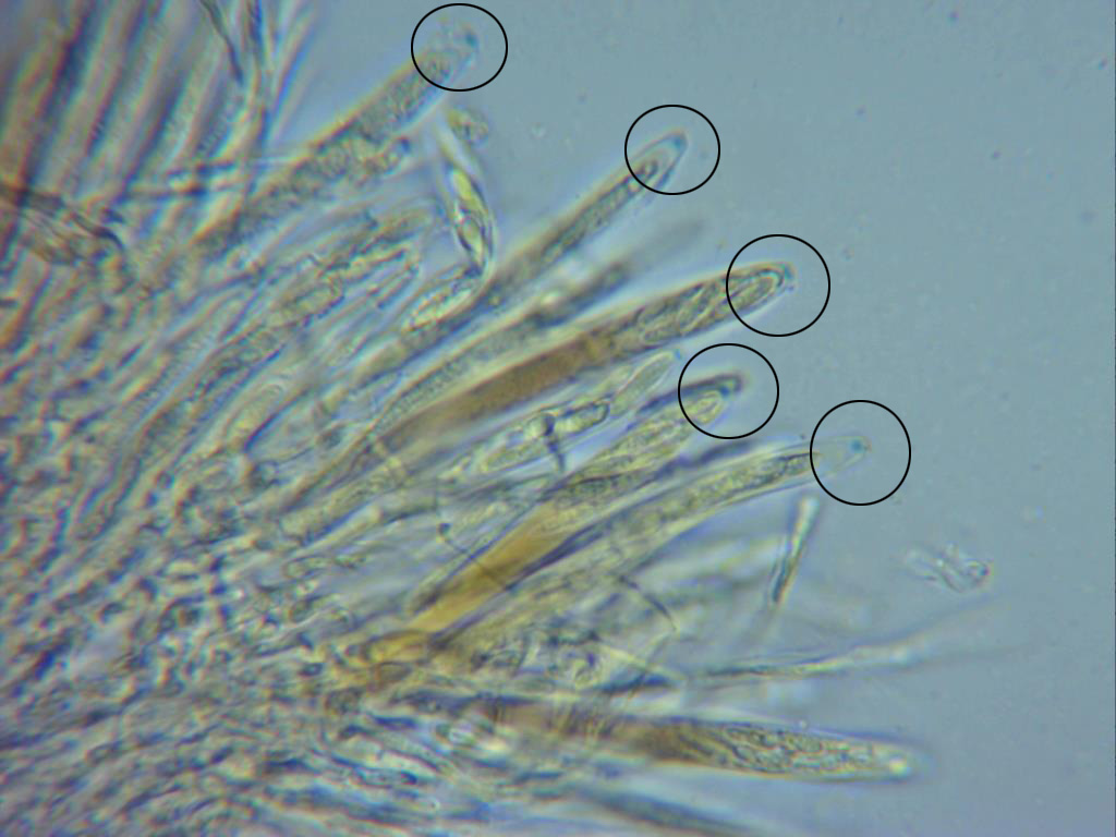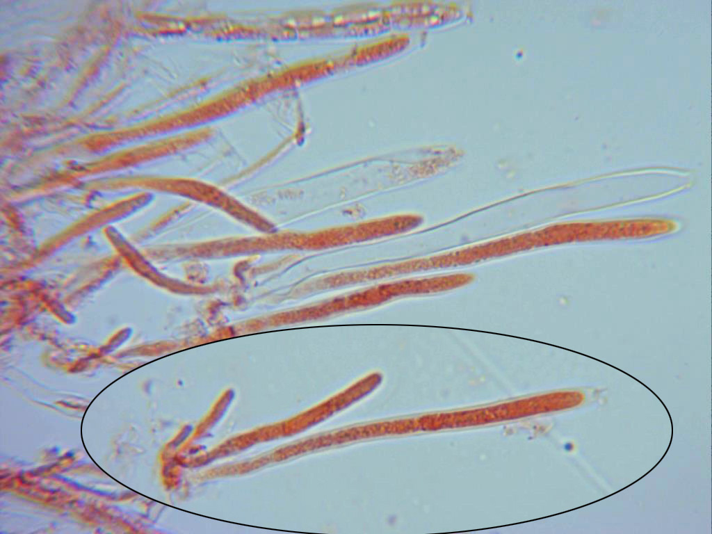 Base de las ascas con uncínulos en su unión con la hifa ascógena, la asca de la imágen con unas medidas de 62 X 5,7 μm.
