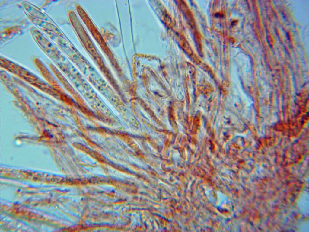 De las tres restantes y considerando el dato de las células marginales multicelulares, así como la presencia de hifas en el subículo, como el comportamiento de las esporas al KOH (aunque solo una parte de las mismas, no todas), con la que parece encajar perfectamente es con la Mollisia peruni.