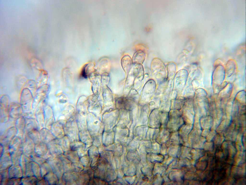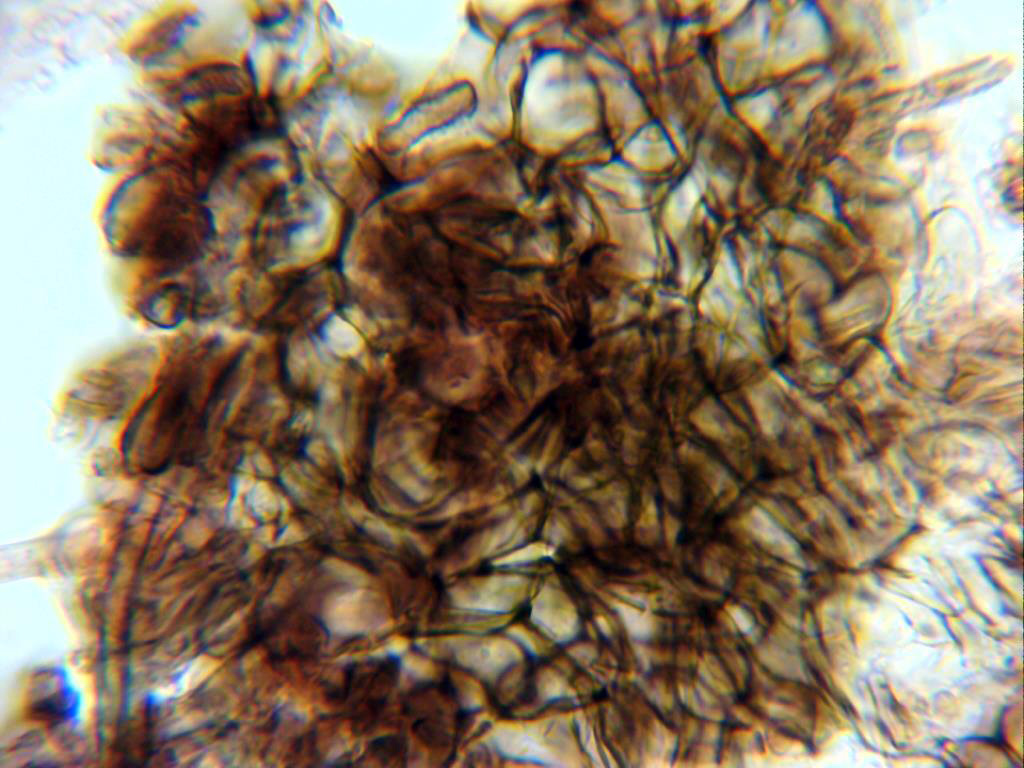 Hifas del excípulo en Melzer, con hifas entre globosas y angulares y de entre 10 a 16 μm.