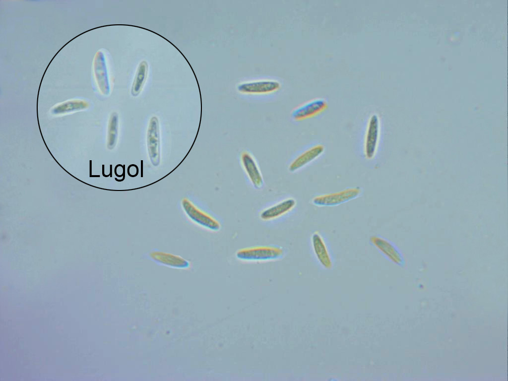Esporas en reactivo de Melzer, inamiloides y en la miniatura las mismas en solución de KOH, en este caso se aprecia un oscurecimiento en su interior, dejando entrever un septo en la parte central de las mismas.