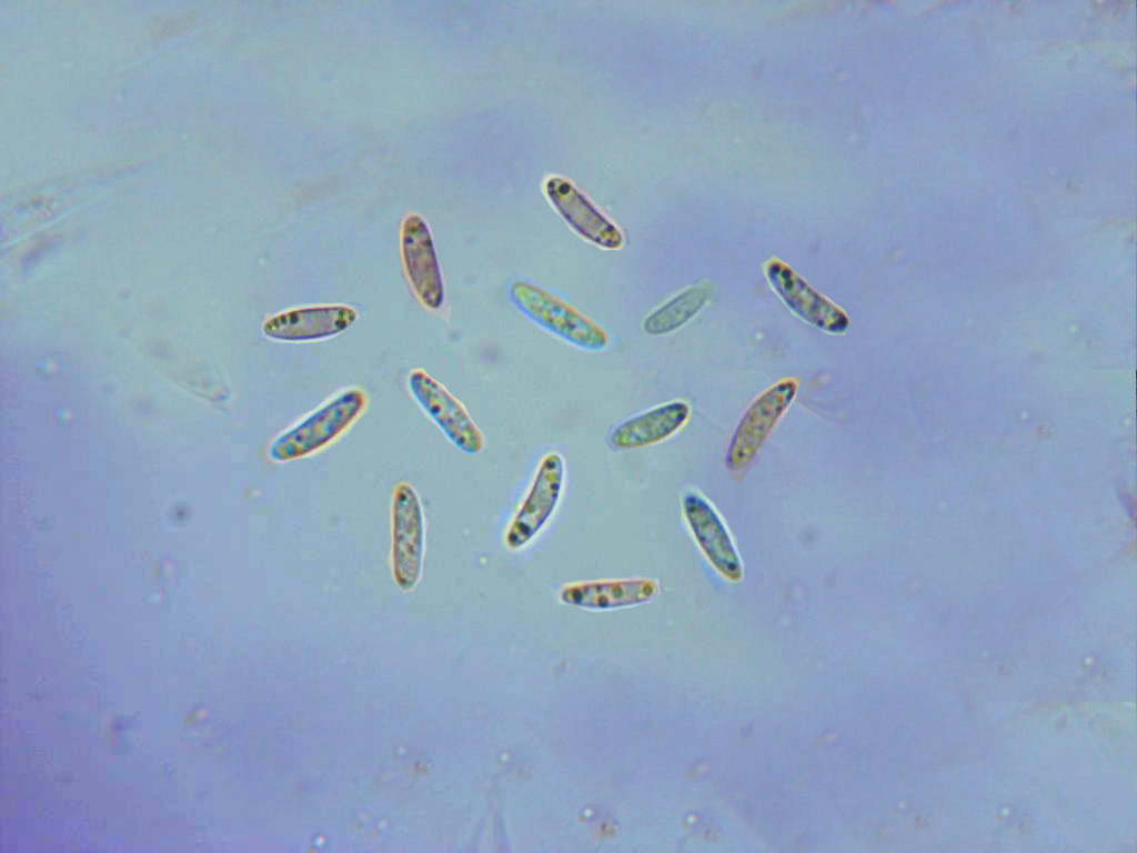 Ascosporas hialinas, de pared fina, entre elipsoides a ampliamente alargadas y cilíndricas, algunas algo curvadas y con gotas de aceite en su interior.