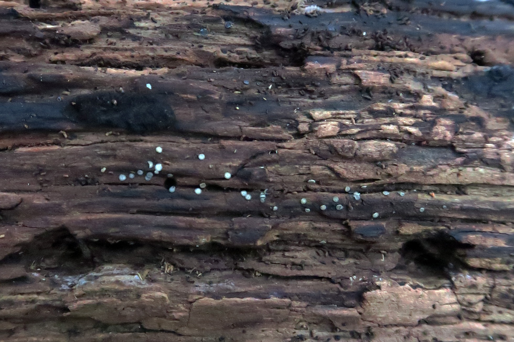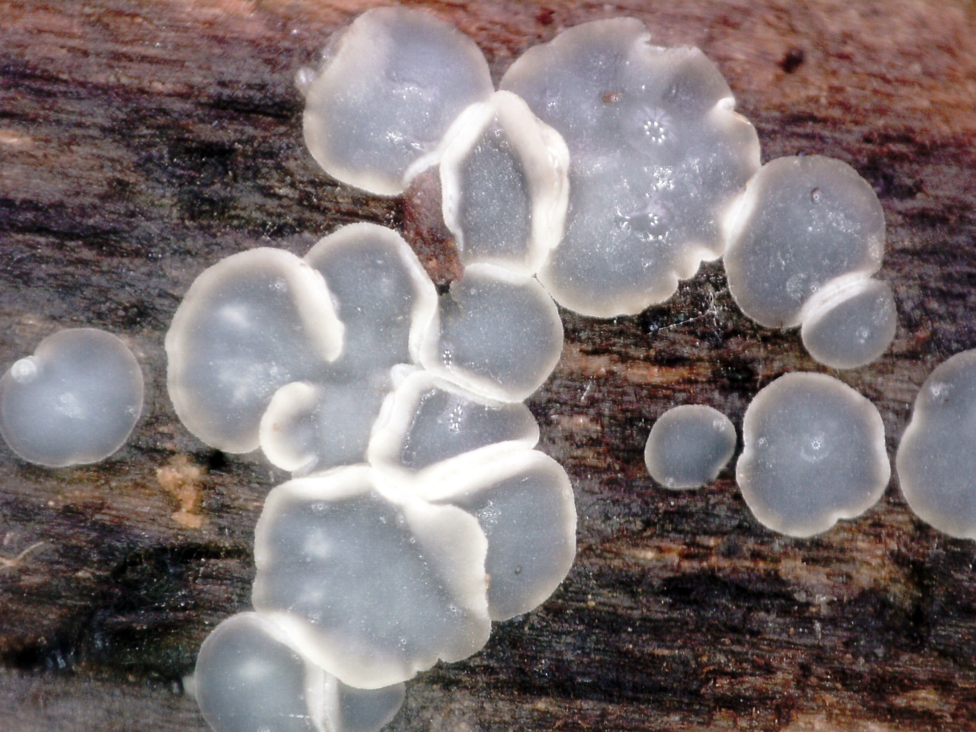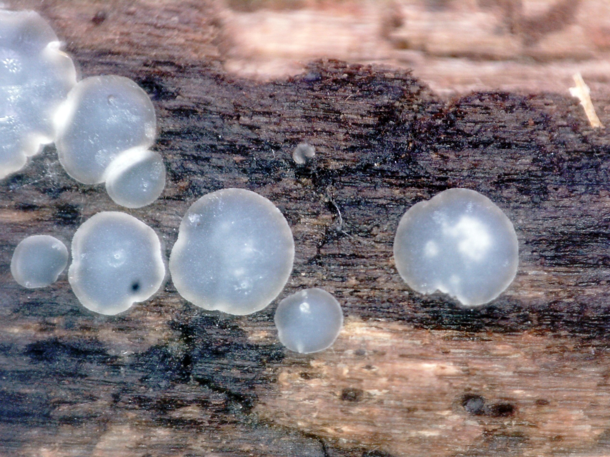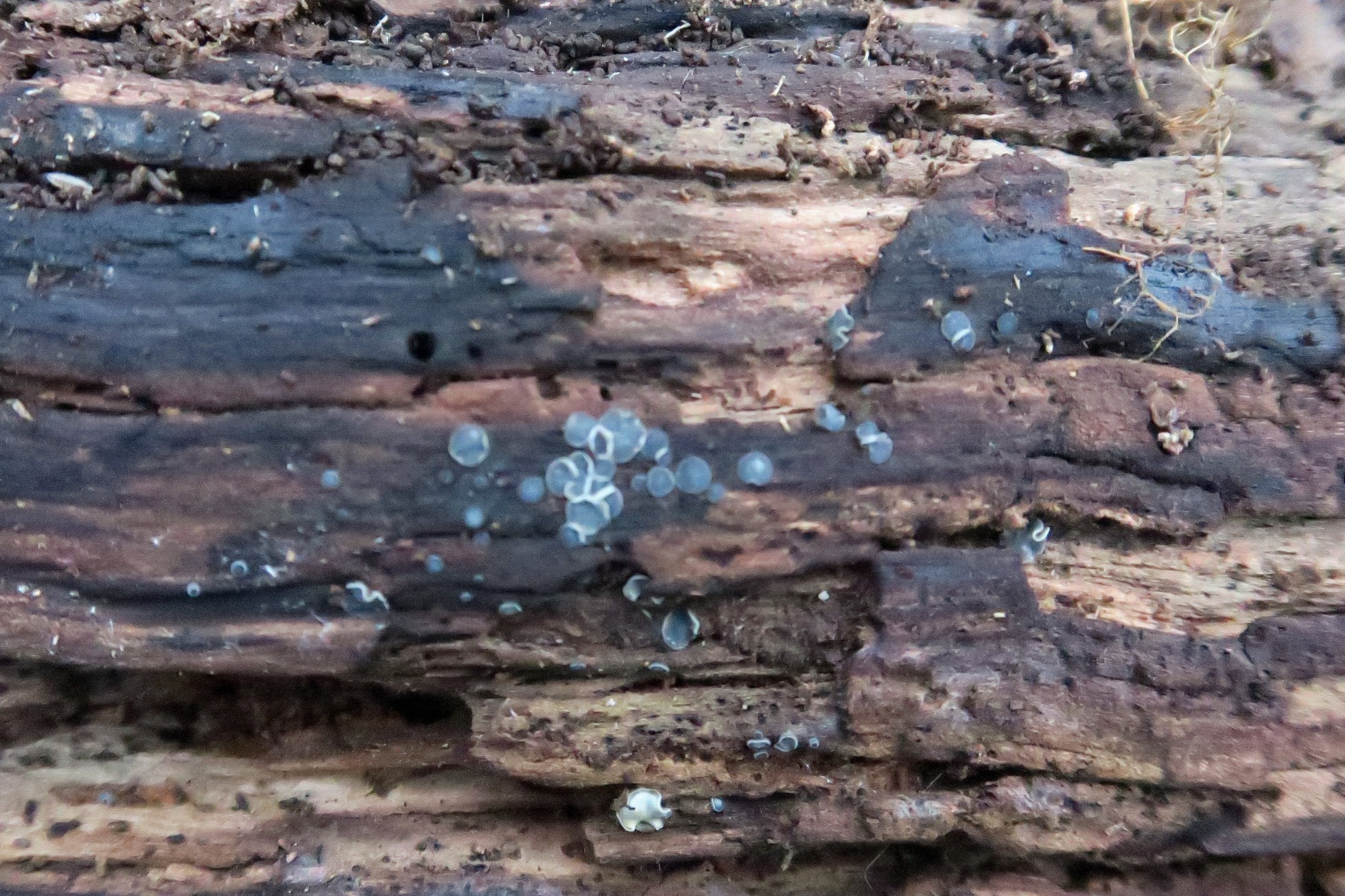 Unos pequeños apotecios de tan solo entre 1,3 a 2,4 mms. de un color gris azulado en forma de disco, en las primeras etapas planos para ondularse sus bordes en los ejemplares adultos.