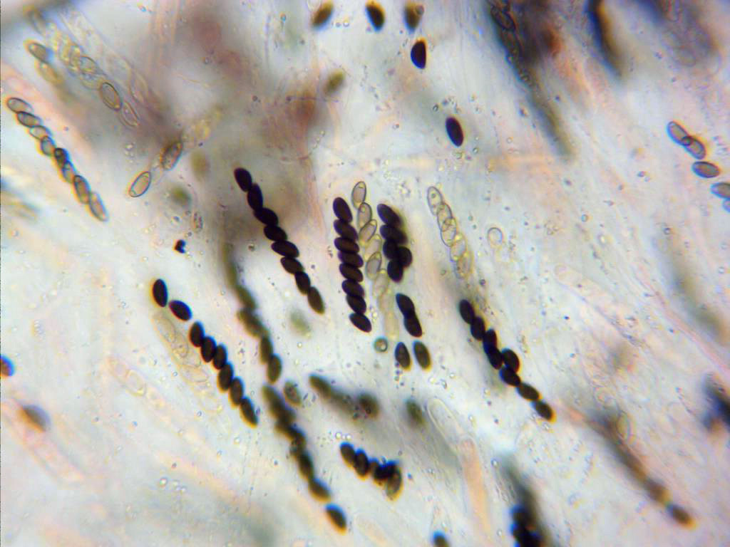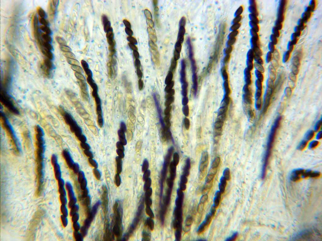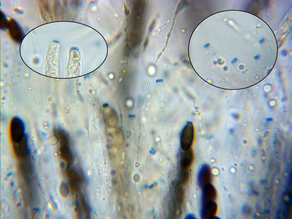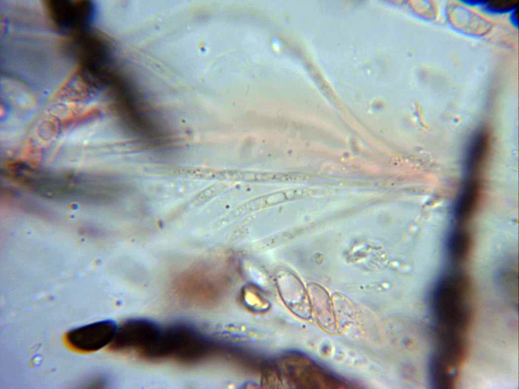 También observé en las muestras unas hifas filiformes y ramificadas, muy difíciles de observar, a modo de paráfisis o quizás también podrían corresponder a la base de las ascas.