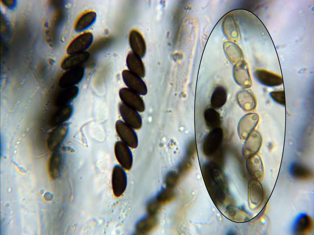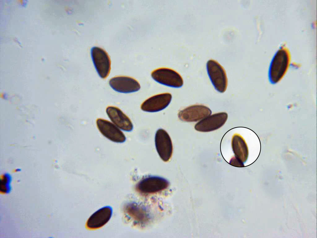 Esporas marrón oscuro, elipsoides, no equilaterales, algo aplastadas por un lado, con hendidura germinal recta (miniatura de la imágen).