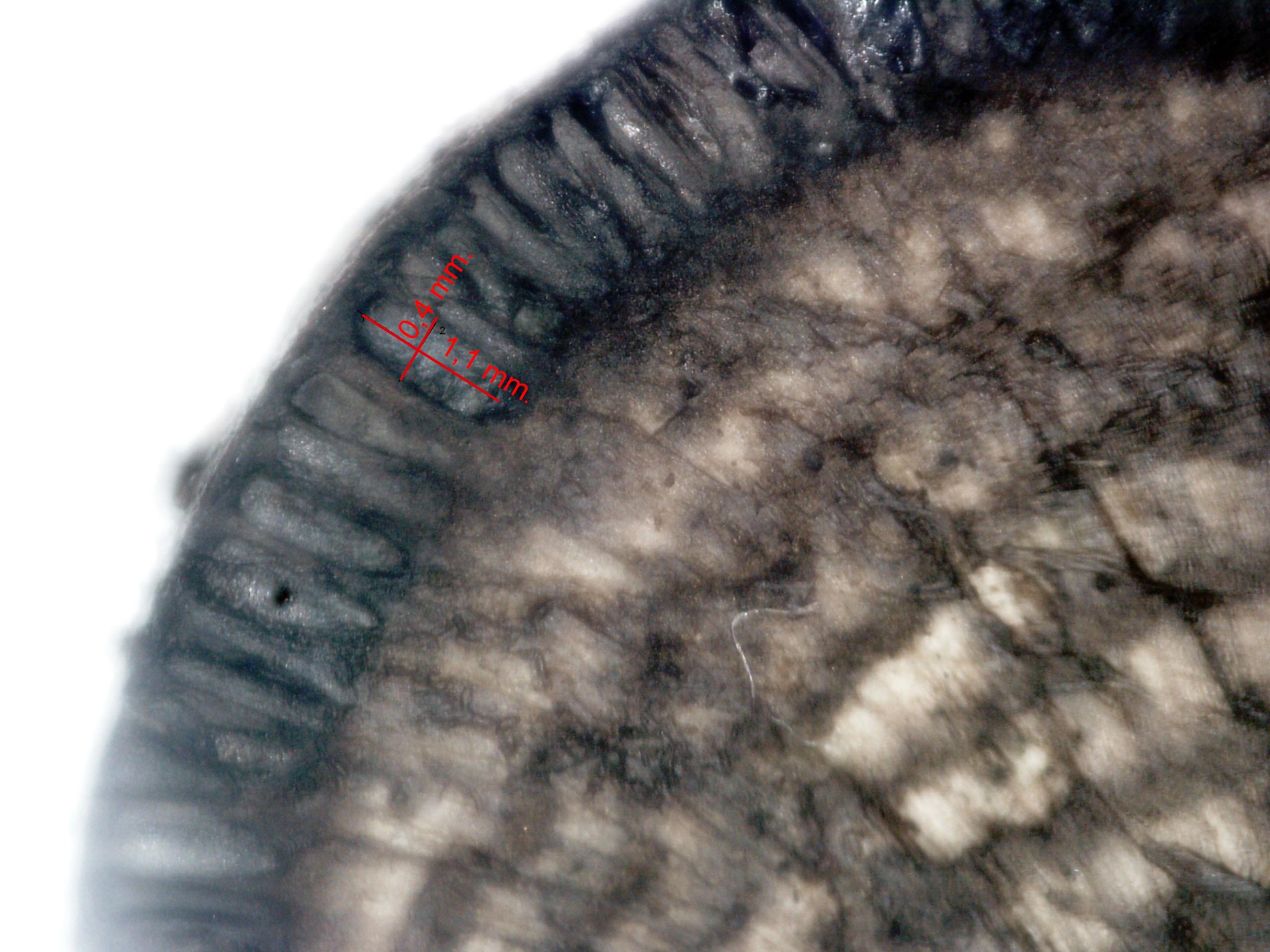 Una sección de los peritecios cilíndricos y alargados, según bibliografía de 1;1,2 X 0.3;0,4 mms., el de la imágen de 1,1 X 0,4 mm. totalmente acorde, por debajo de los peritecios se observan las bandas concéntricas de crecimiento, de entre 0,2 y 0,4 mms.