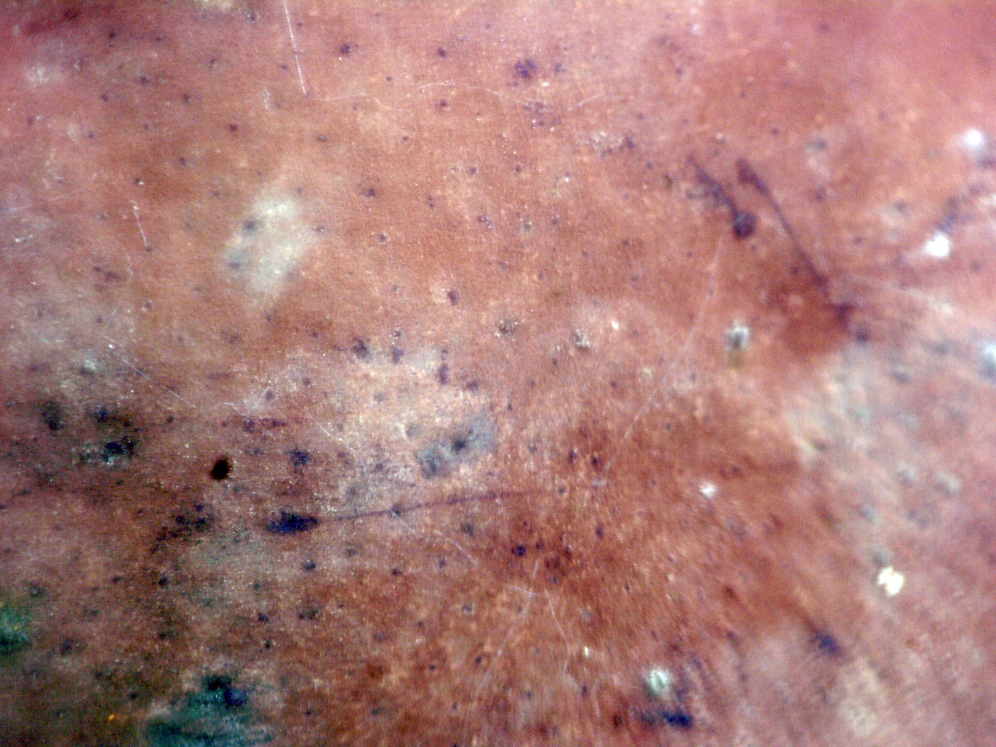 Superficie del mismo ampliada, en ella prácticamente no se observan ostiolos, solo se pueden intuir unos pequeños puntos al observarla con el microscopio de mano.