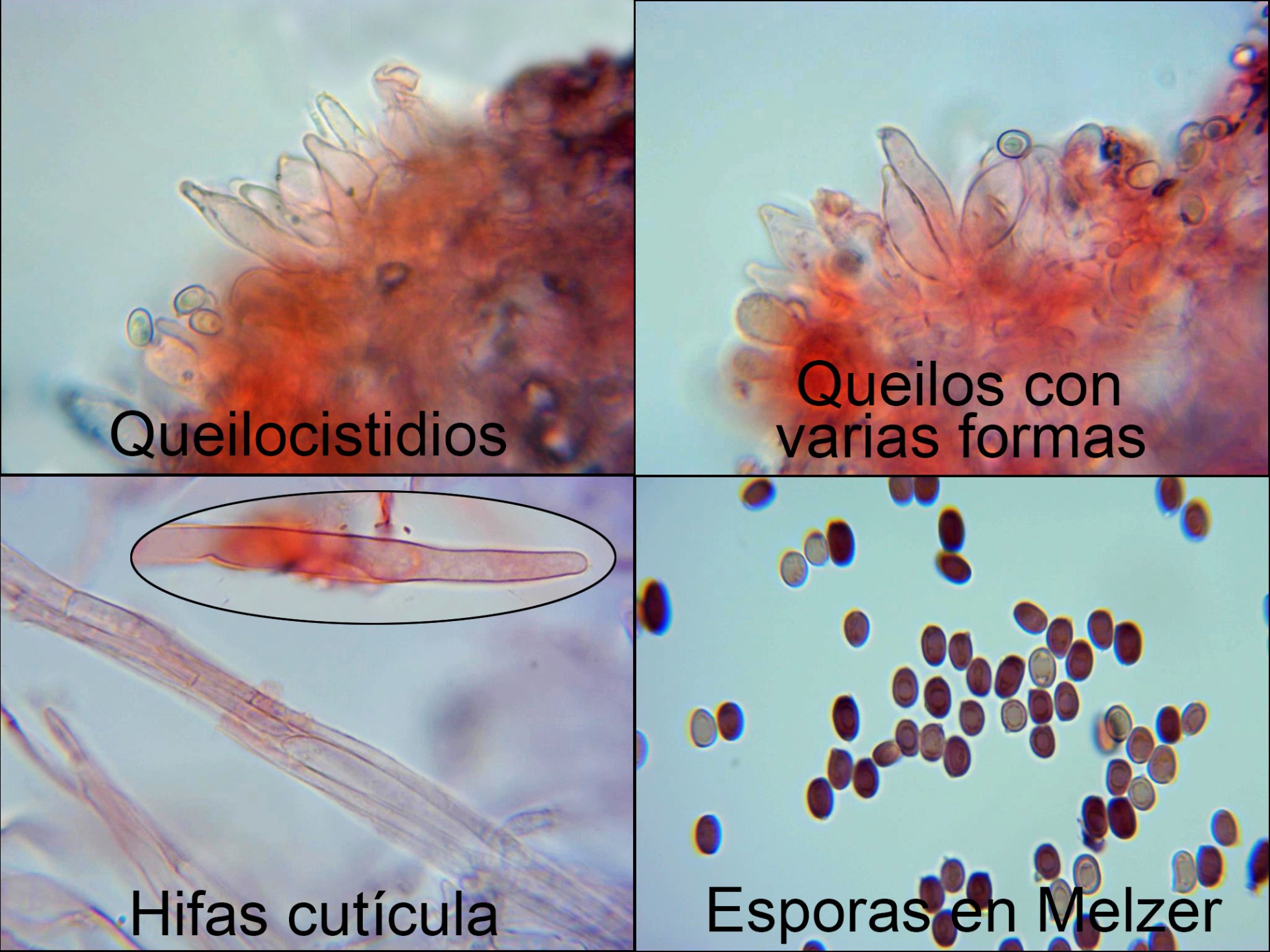 Hifas de la cutícula paralelas y terminando algunas en formas redondeadas a modo de Pileocistidios, queilocistidios de formas variadas y algunos con cristalizaciones en el ápice y esporas dextrinoides con reactivo de Melzer.