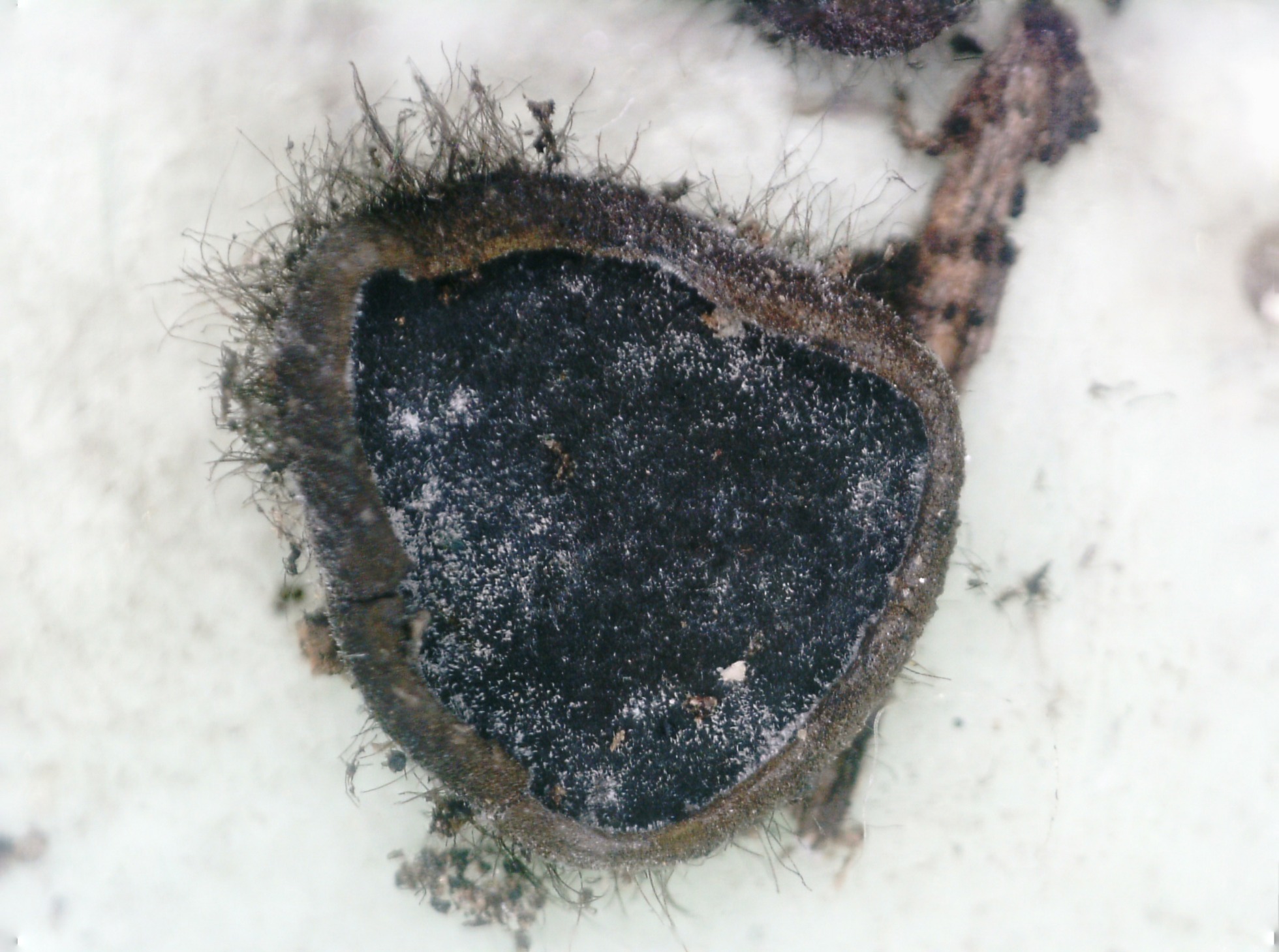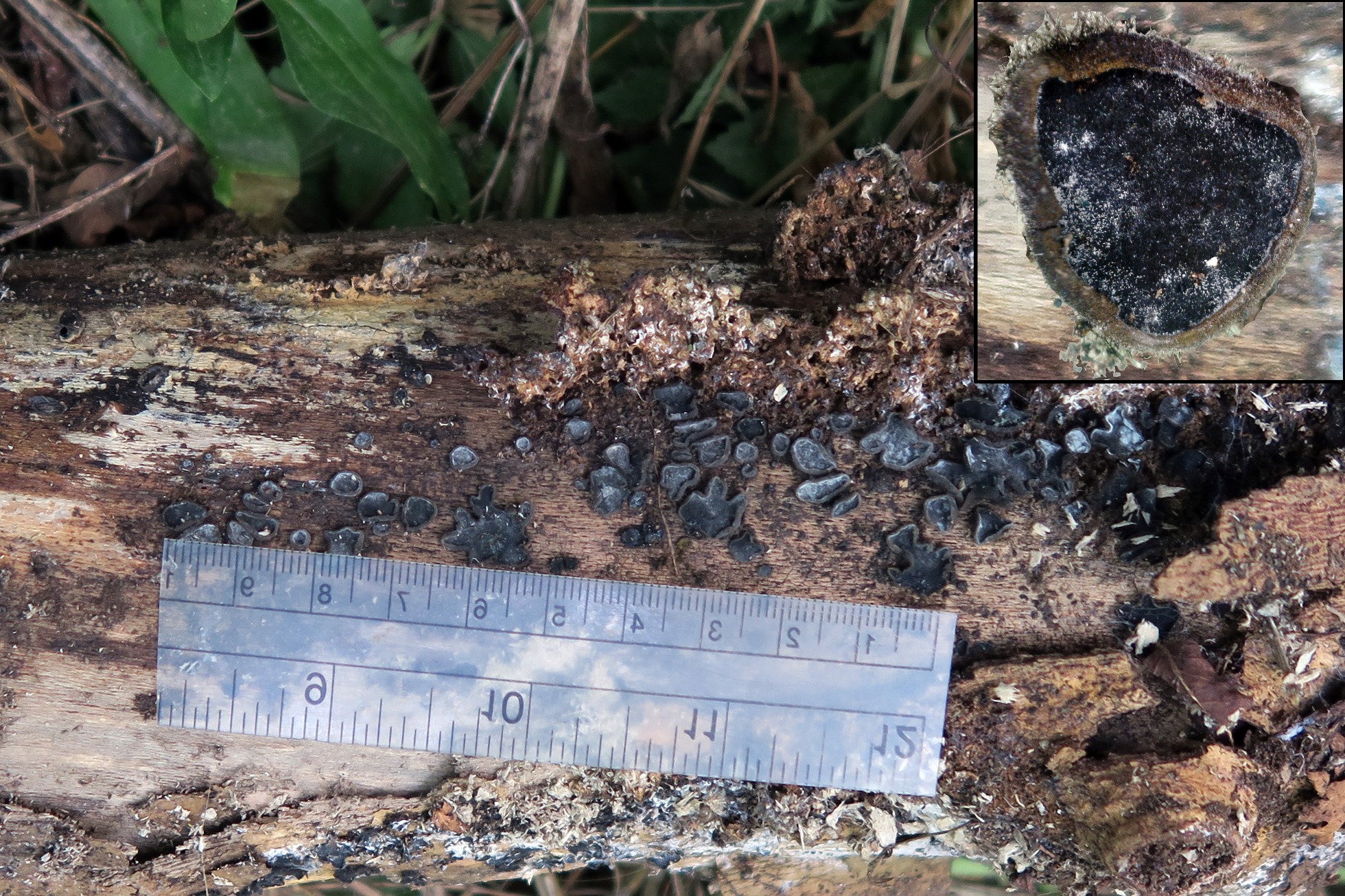 Apotecios de pequeño tamaño, el mayor de poco más de un cm., en un principio en forma de disco o plato aplanado, con el borde incurvado hacia arriba, para pasar ya en estado adulto a formas irregulares y ameboides con el borde en formas onduladas. De un color azul negruzco sucio y con el borde con tonos oliváceos.
