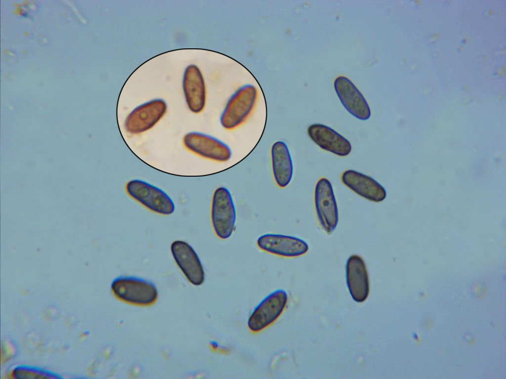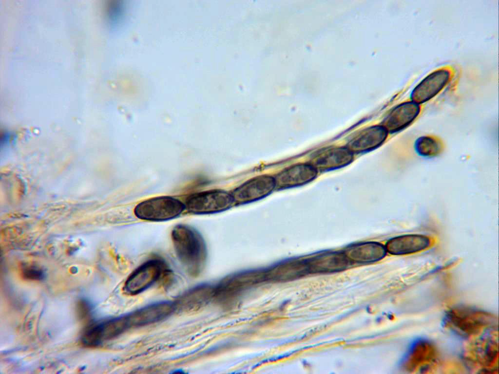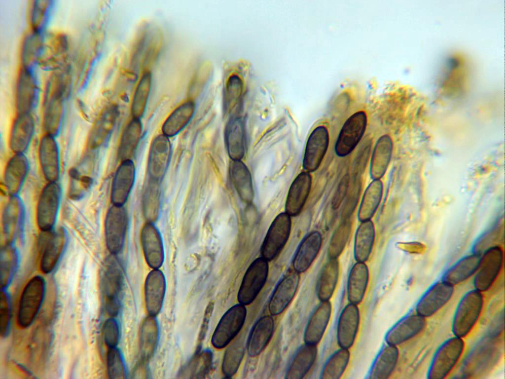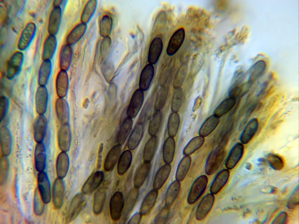 Ascosporas ampiamente ovales, en muchos casos aplanadas lateralmente al acercarse a los extremos (como en forma de zapatilla), bigutuladas y con unas medidas en mi caso de 10,5;12 X 4,2;4,9 micras.