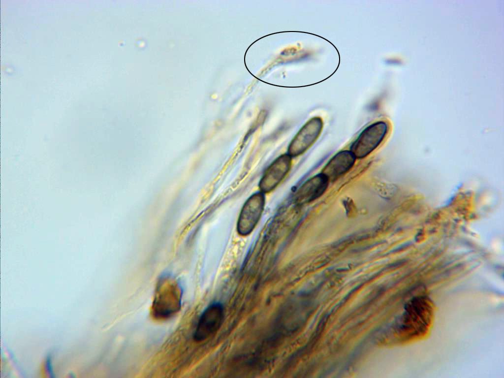 Paráfisis cilíndricas, filiformes, con un ensanchamiento en el ápice de aspecto sucio, sobresaliendo estas por encima del nivel de las ascas.