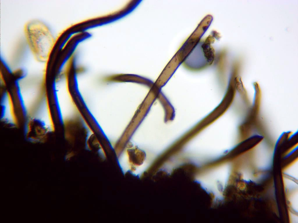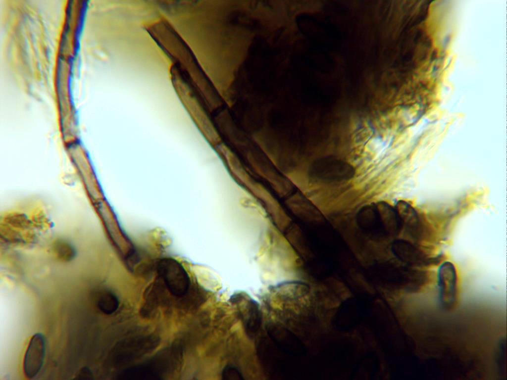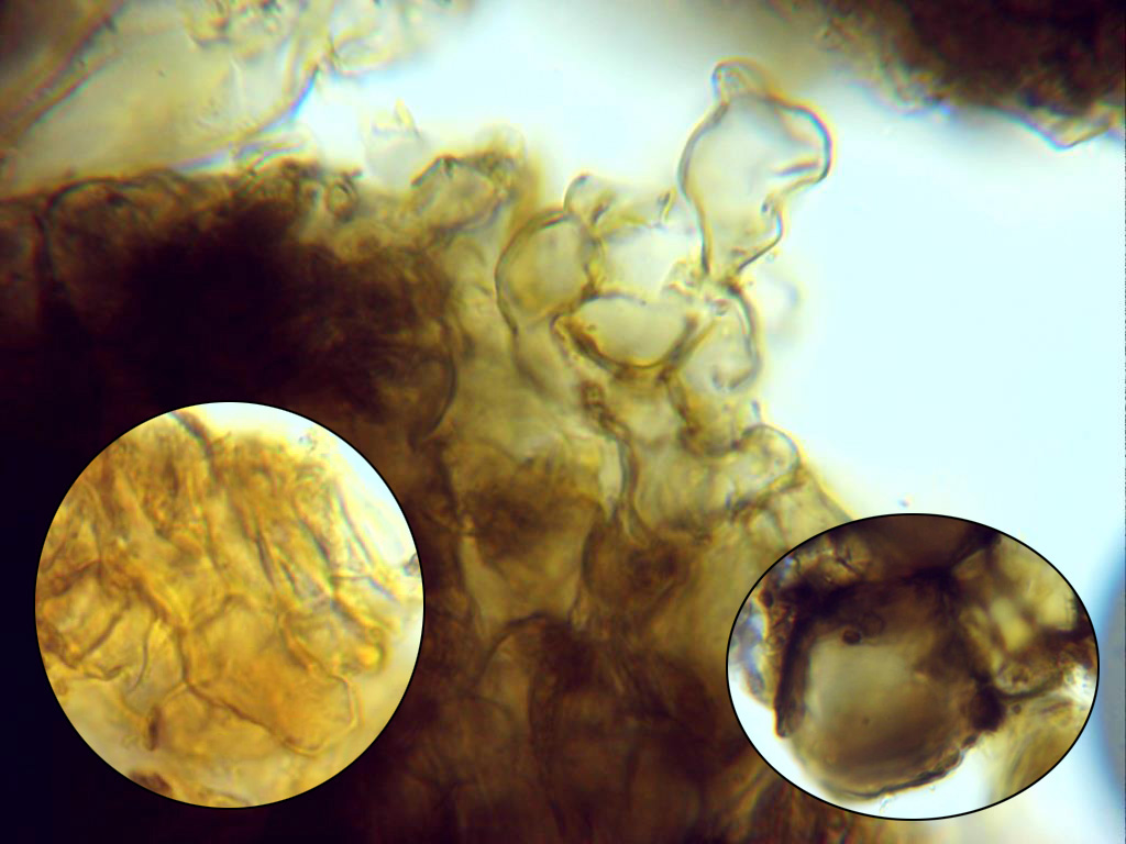 Hifas del excípulo de color marrón verdoso, con formas irregulares, angulosas con bordes redondeados, de pared gruesa y pigmentadas. En la miniatura de la derecha en reactivo de Melzer.