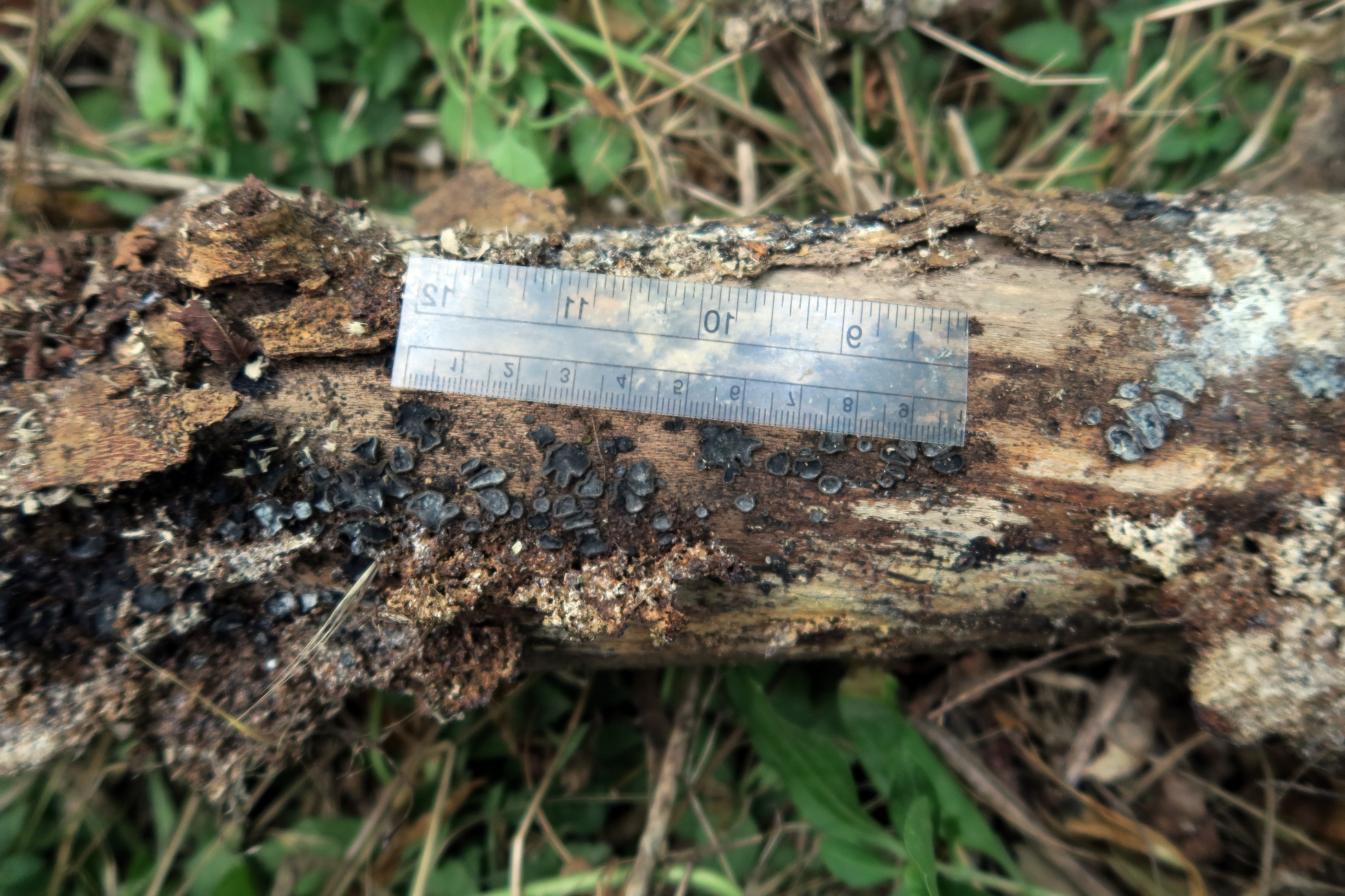 Hoy os presento un ascomiceto fotografiado el pasado 27 de Agosto, brotando de forma masiva por la parte de debajo de un tronco en una chopera.