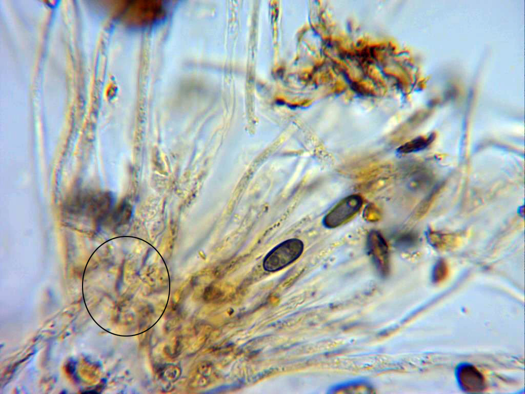 Paráfisis ramificadas, con tenue contenido y con presencia de uncínulos tanto en la base de estas como en la base de las ascas.
