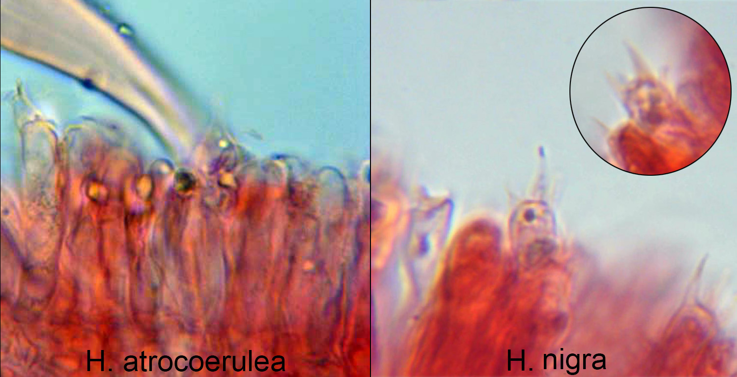 La pigmentación tanto de los pleurocistidios como de los queilocistidios en el caso de la Hohenbuehelia nigra, deduzco que pueden ser los causantes de la coloración más oscura de las láminas de esta.