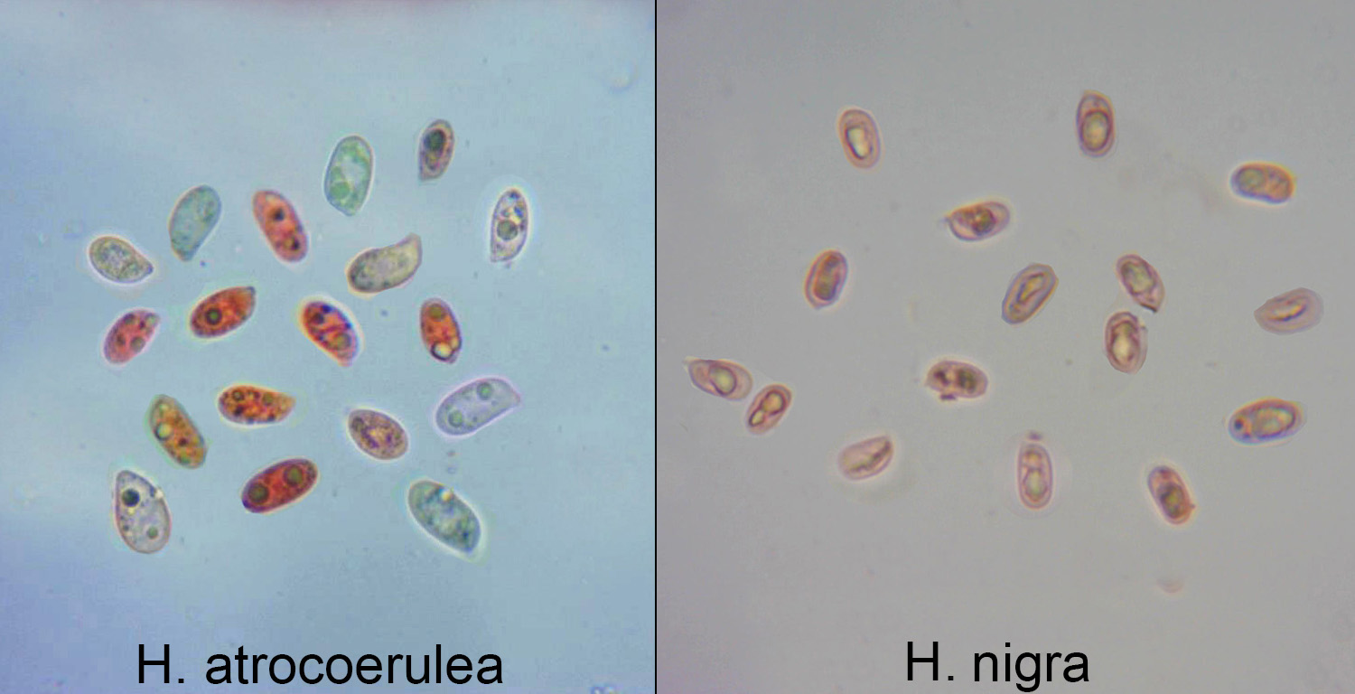En el caso de la Hohenbuehelia nigra, asimismo cilíndricas, elipsoides, con una discreta apícula lateral, hialinas y con vacuolas irregulares en su interior. Las medidas en este caso de 6,7;8,4 X 3,7;5,1µm., considerablemente por debajo de la anterior.