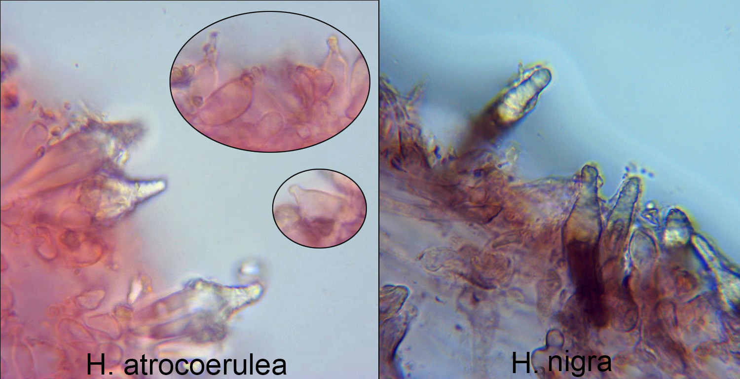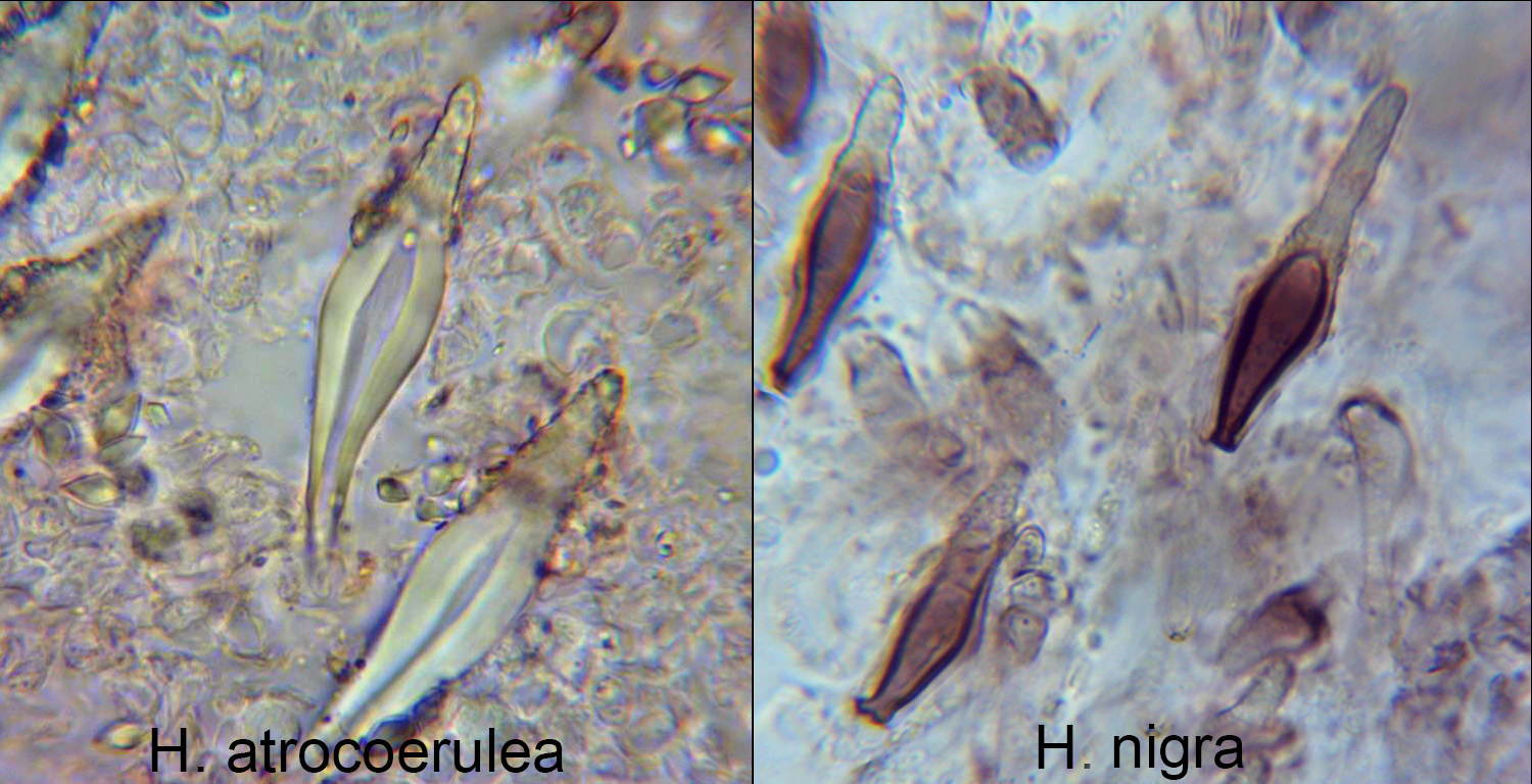 Hará cosa de un par de años presenté una Hohenbuehelia que en aquel momento consideré que se trataba de Hohenbuehelia atrocaerulea. Como no estaba muy convencido con la identificación posteriormente reabrí el tema y consideré que encajaba mejor con la Hohenbuehelia nigra, y así es como la tenía desde entonces. Anteayer me topé con la Hohenbuehelia atrocaerulea, ahora he podido comprobar en vivo las sutiles diferencias microscópicas entre ambas y he preferido montar un Post con una comparativa entre ellas, enfatizando estas diferencias.