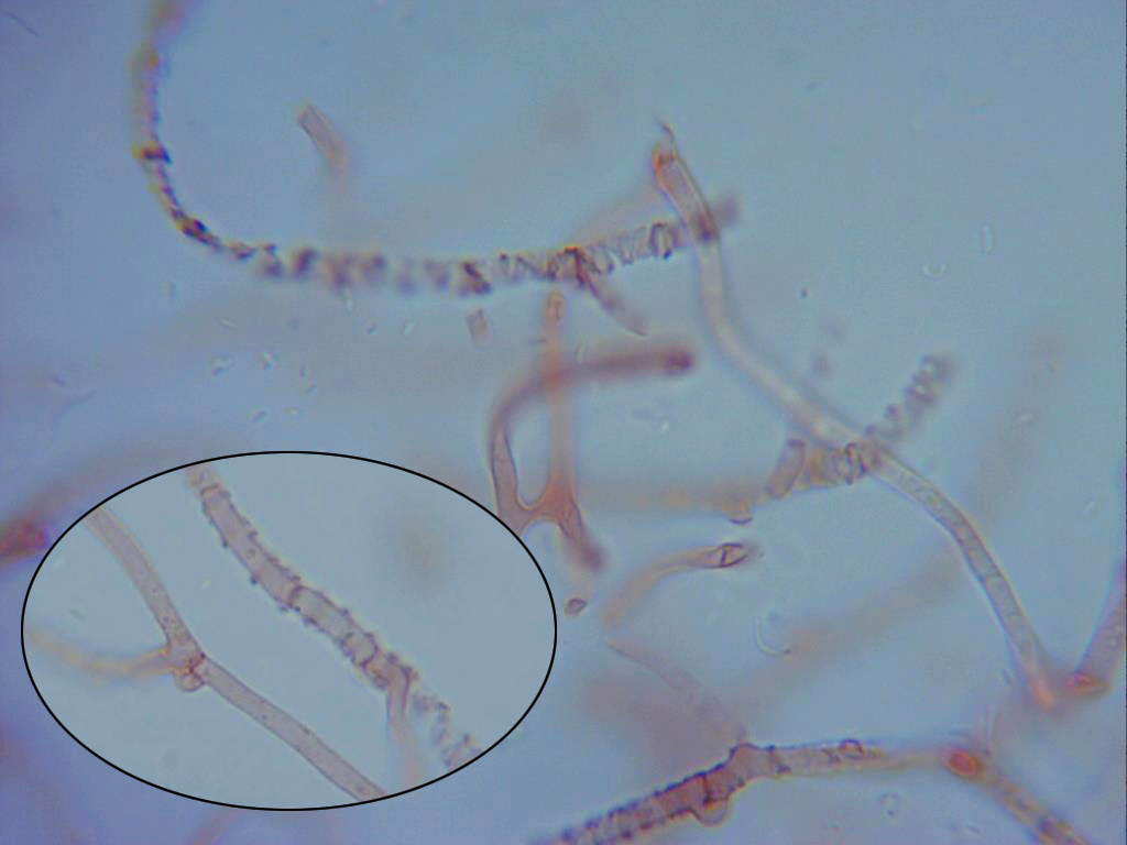 Imágen por debajo de la suprapellis, en este caso común a ambas, con hifas separadas por gelificación y con incrustaciones en zig zag a modo de cebra en ambas especies. En los dos casos asimismo provistas de fíbulas.