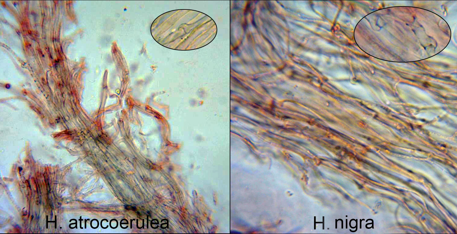 Pileipellis con tres capas, esta imágen corresponde a la suprapellis a 400 aumentos, en los dos casos con hifas provistas de fíbulas (miniatura), en el caso de la Hohenbuehelia nigra con las hifas algo mas pigmentadas.