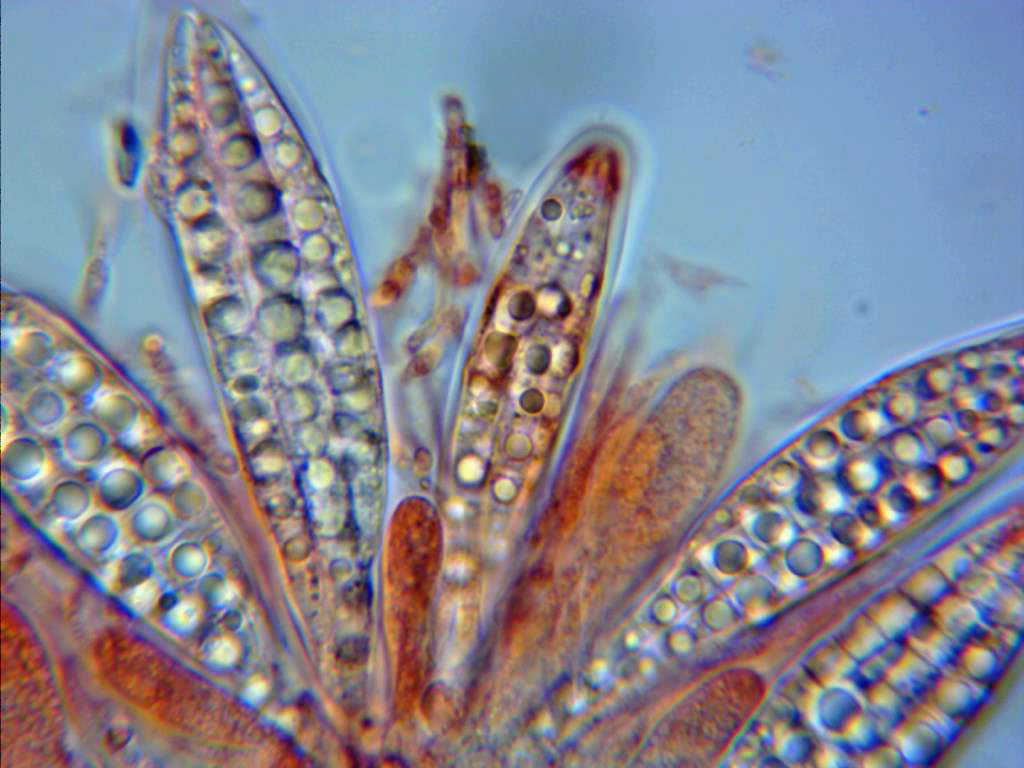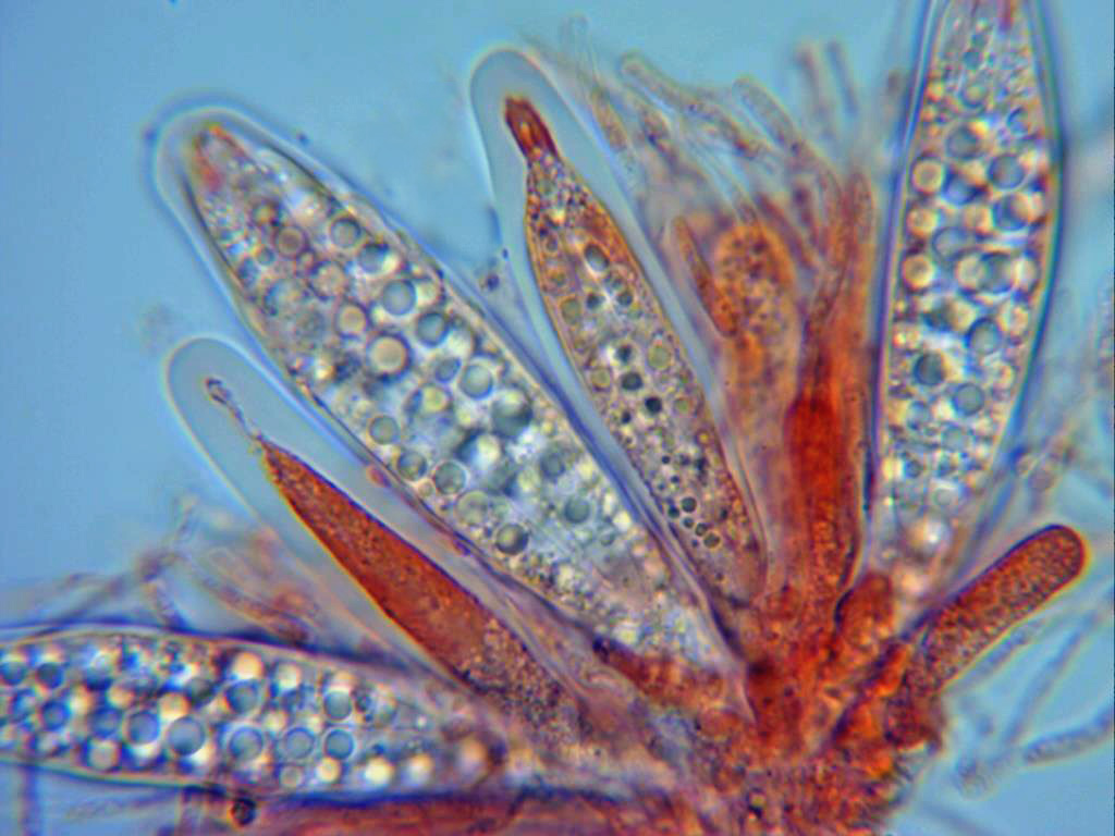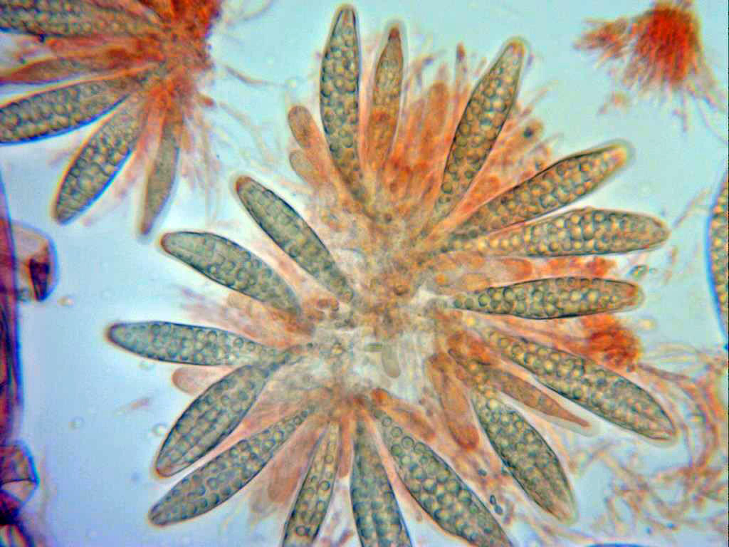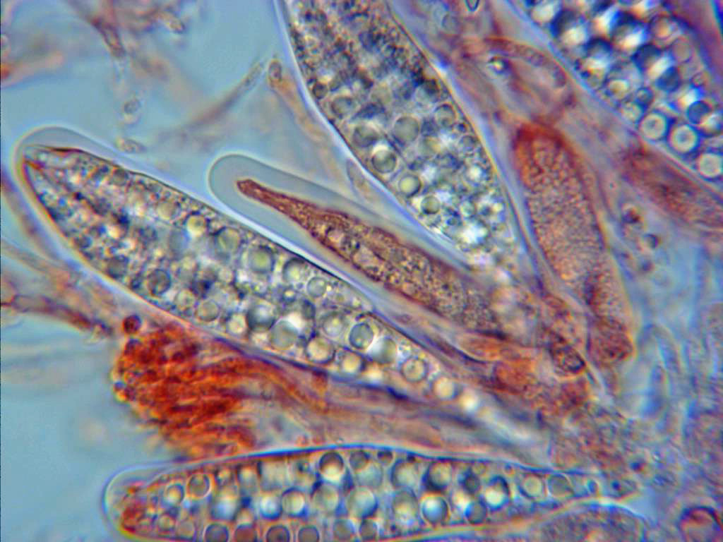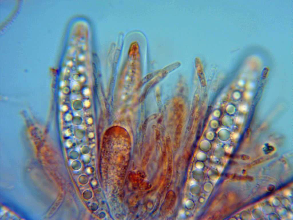 Paráfiis numerosas entre las ascas, filiformes, hialinas y más cortas que estas.