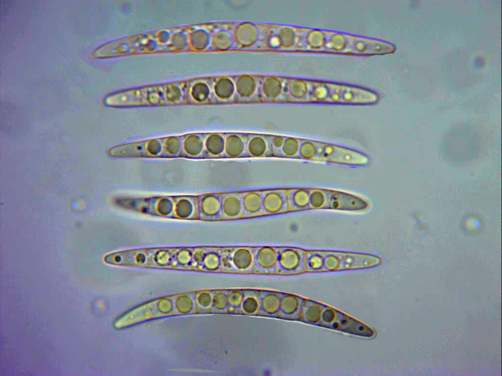 Ascosporas fusiformes, hialinas, rectas o ligeramente curvadas, estrechas y estrechamente redondeadas en ambos extremos, no constreñidas en los septos y con vacuolas en su interior.