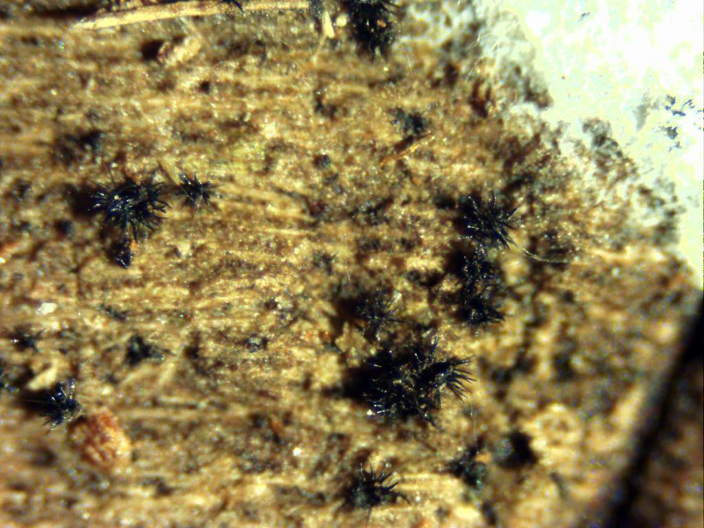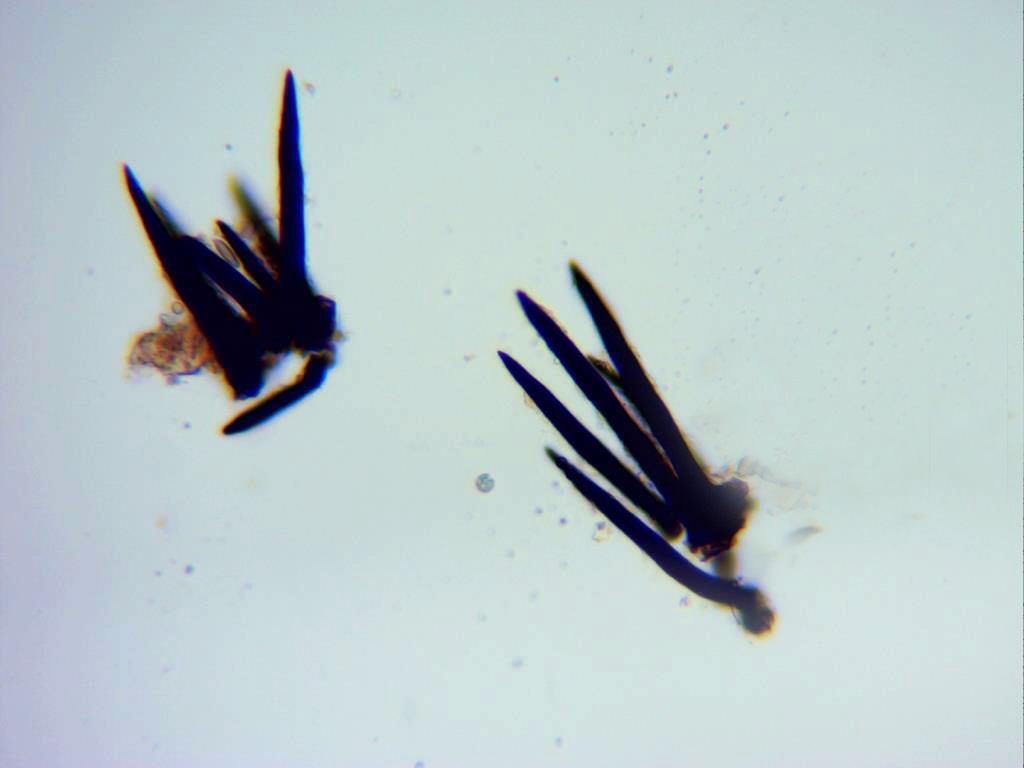 Setas de la superficie a 400 aumentos, rectas o muy ligeramente curvadas, de un color marrón muy oscuro (casi negro) y con unas medidas de 69.8 a 86,6 por 5.4 a 6.6 μm.