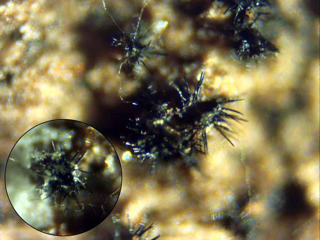 Una roña blanquecina, pulverulenta y granulosa, que al observar su borde con el microscopio de sobremesa y a 100 aumentos, me encontré con la imágen de la miniatura.