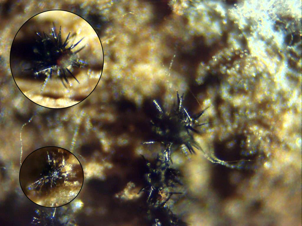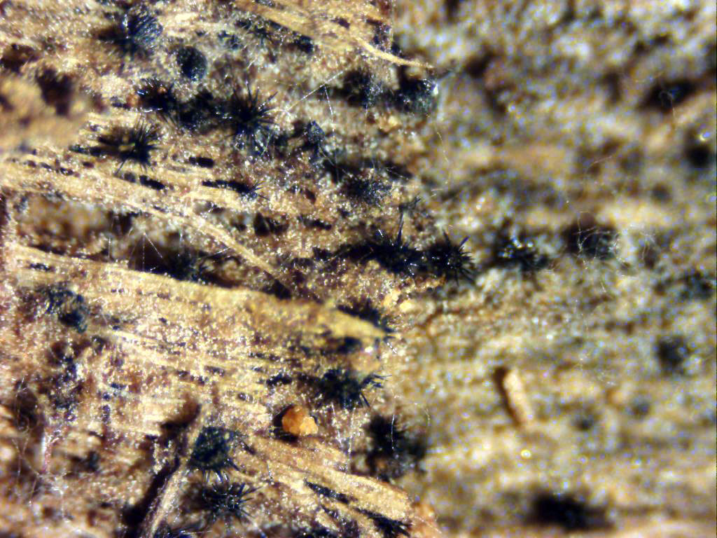 Muy diminutos pseudotecios, de tan solo entre 0,13 y 0,29 mm., con forma globosa, color negro brillante y abundantes setas en su superficie.