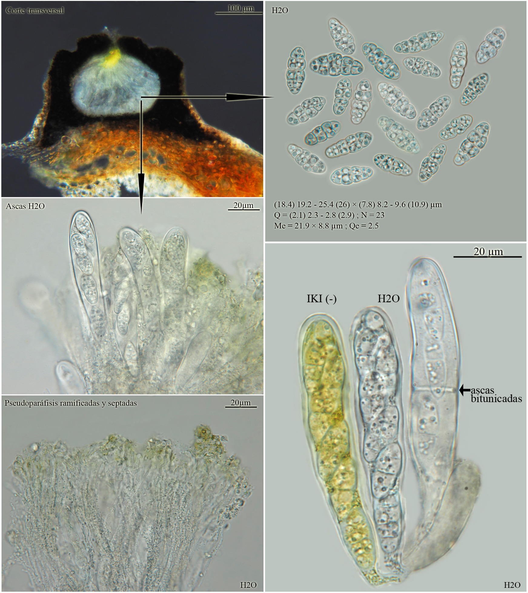 Ascas bitunicadas de hasta 140 x 14-17µm. Pseudoparáfisis ramificadas y septadas, impregnadas con una sustancia con pigmento de color amarillento o verdoso distribuida a lo largo de la grieta a modo de tampón, probablemente hasta la maduración de las esporas (foto 3, corte).