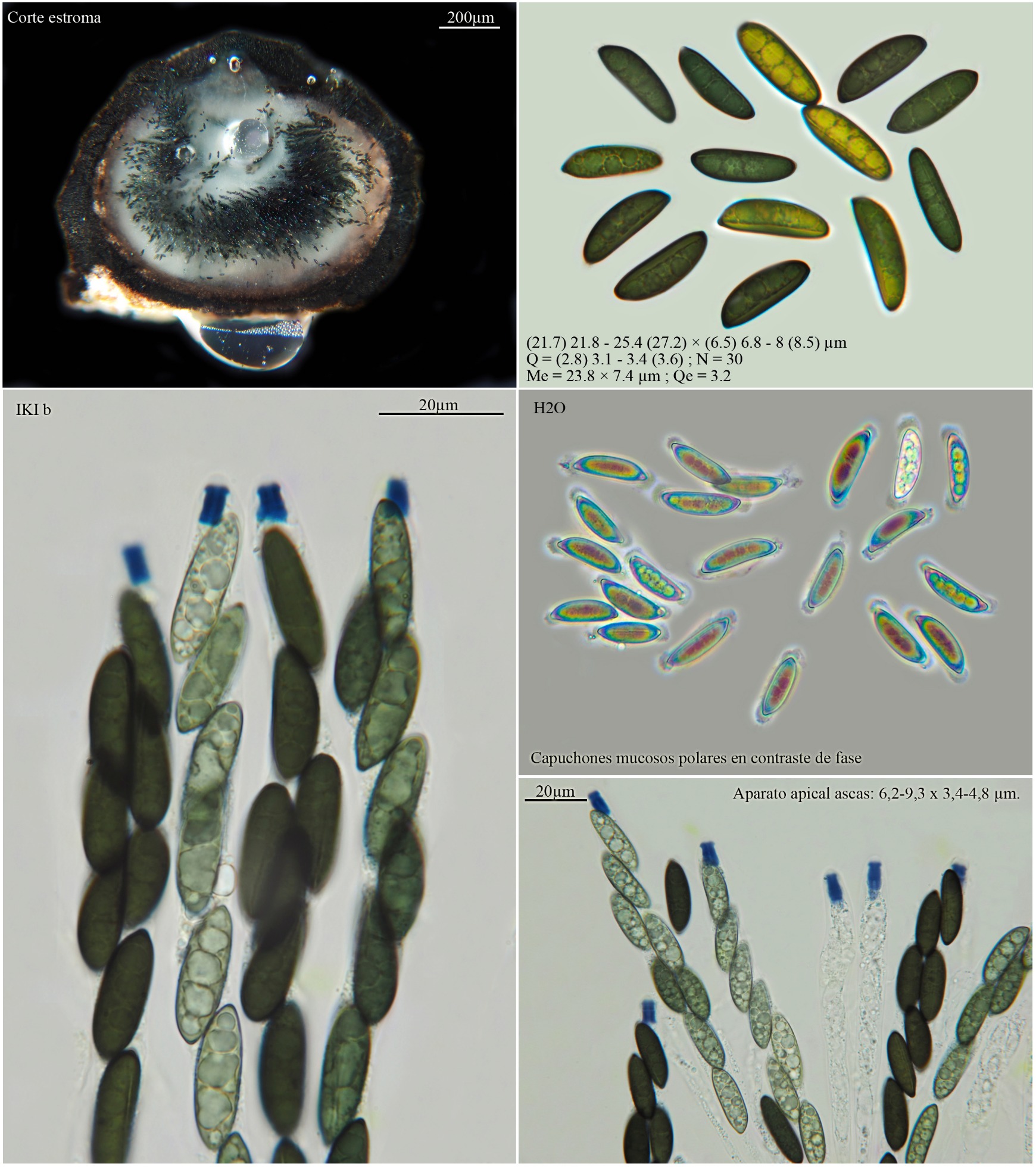 Las ascas, iki b, están provistas de un aparato apical conspícuo 6,2-9,3 x 3,4-8,8 µm. Esporas: (21.7) 21.8 - 25.4 (27.2) × (6.5) 6.8 - 8 (8.5) µm; Q = (2.8) 3.1 - 3.4 (3.6) ; N = 30; Me = 23.8 × 7.4 µm ; Qe = 3.2, provistas de una hendidura germinal recta del lado ventral así como un tapón mucoso (buscar esporas jóvenes) que a veces forma una linea longitudinal en la parte ventral. Recolectada sobre madera indeterminada (Quercus o Fraxinus).