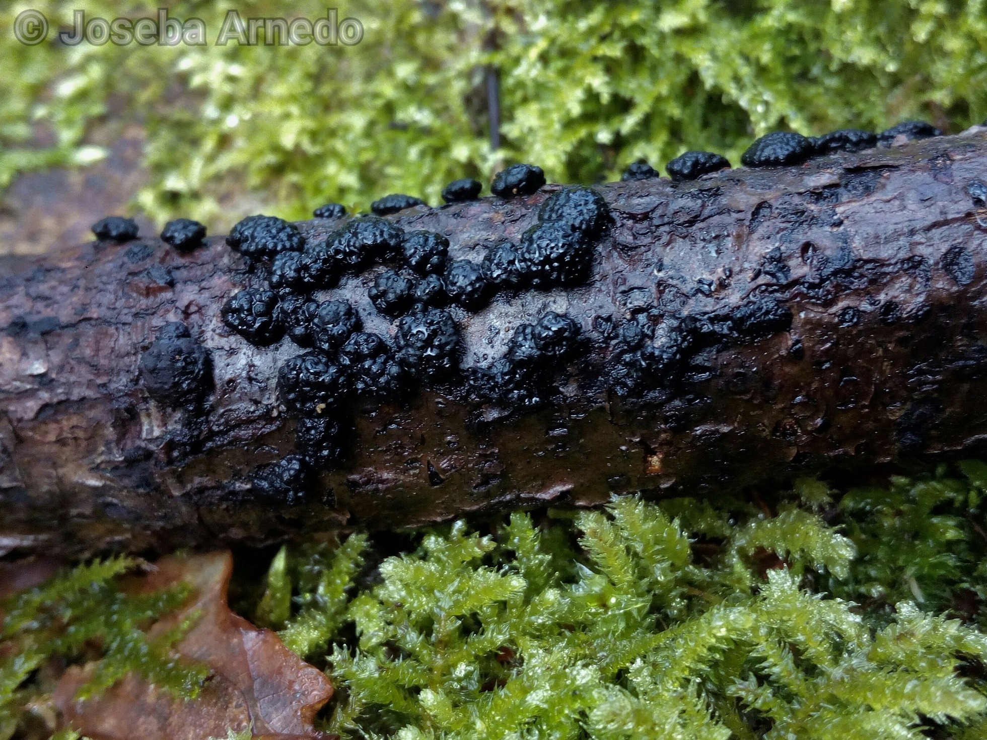 Pequeño estroma de hasta 1 cm de diámetro de color negro al madurar y que recuerda a una mora por los numerosos ostiolos que cubren toda su superficie. Crece en maderas degradadas de Quercus, la de esta recolecta lo hacia en una vieja rama de Quercus robur.