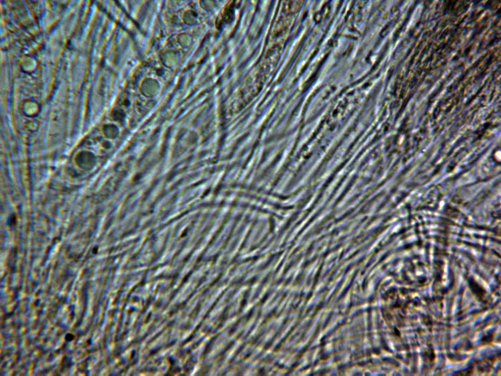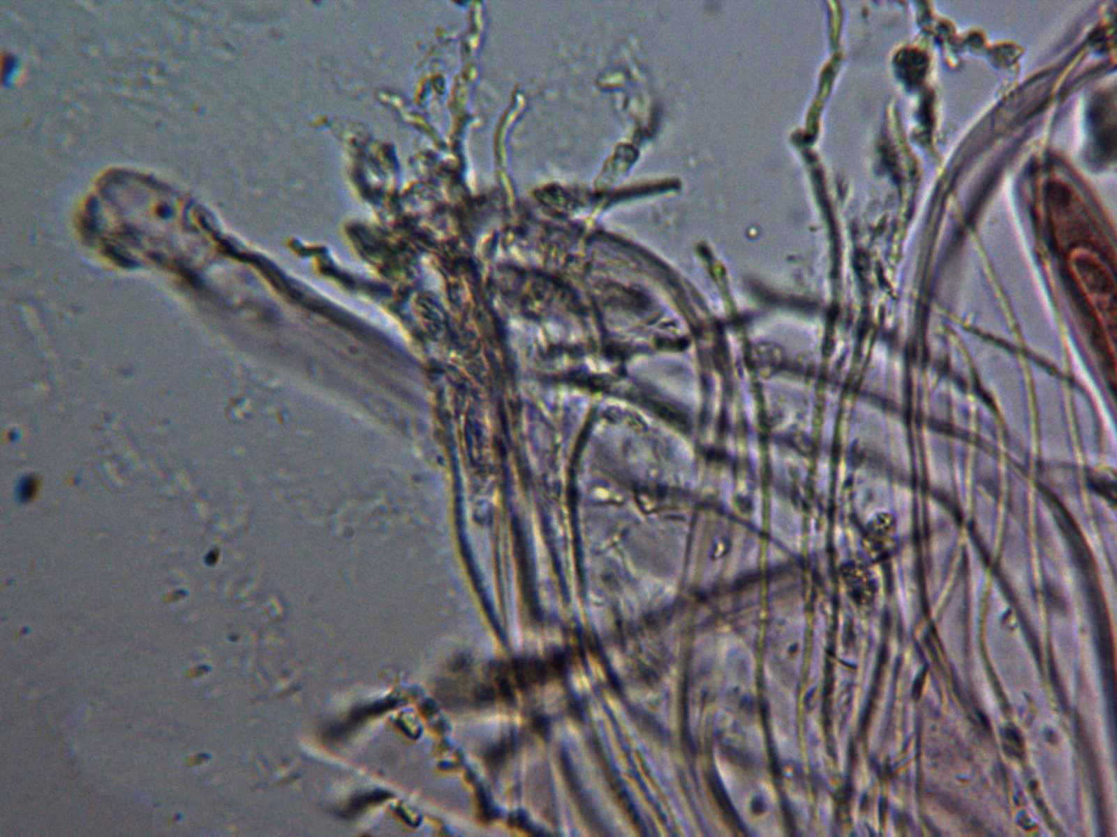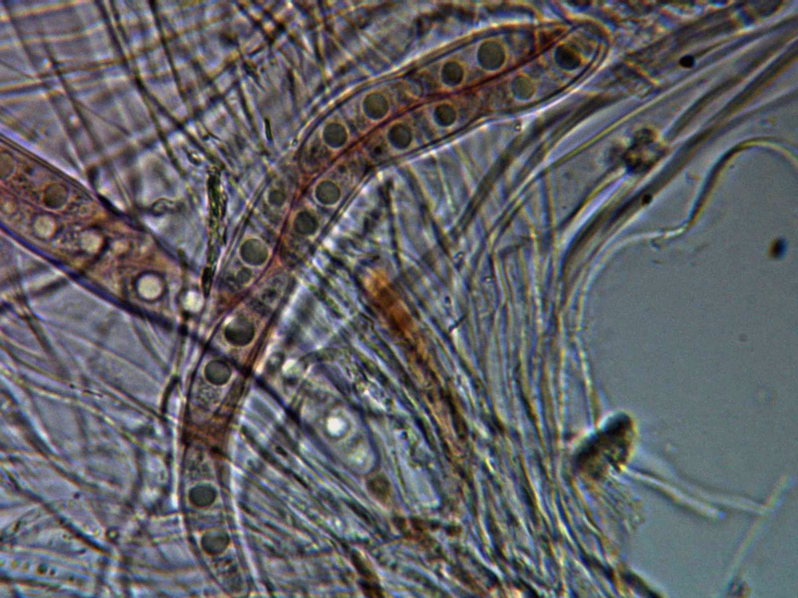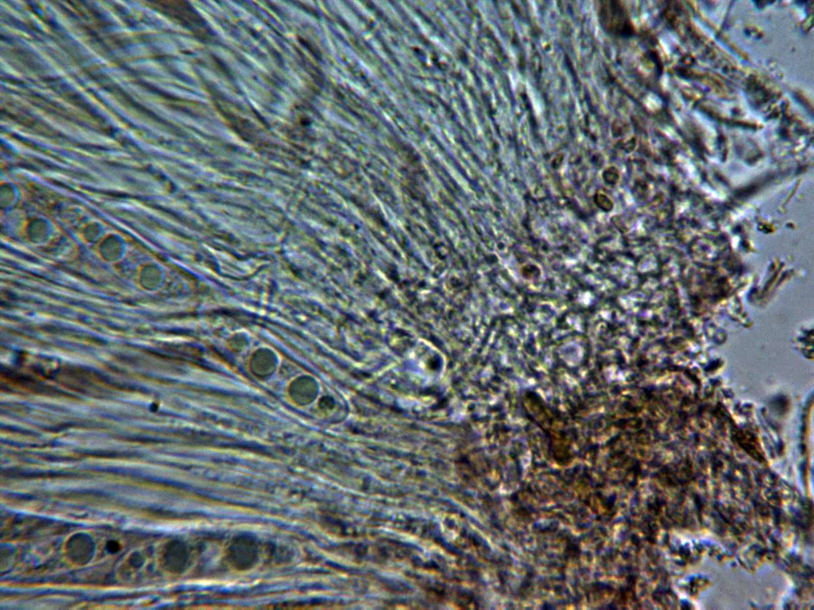 Paráfisis muy abundantes, filiformes, de muy pequeño grosor y sobresaliendo por encima del nivel de las ascas.