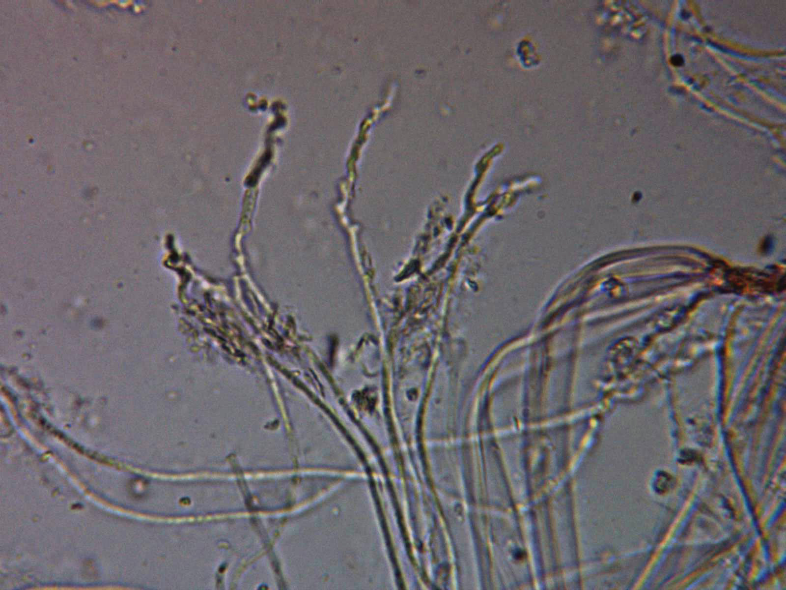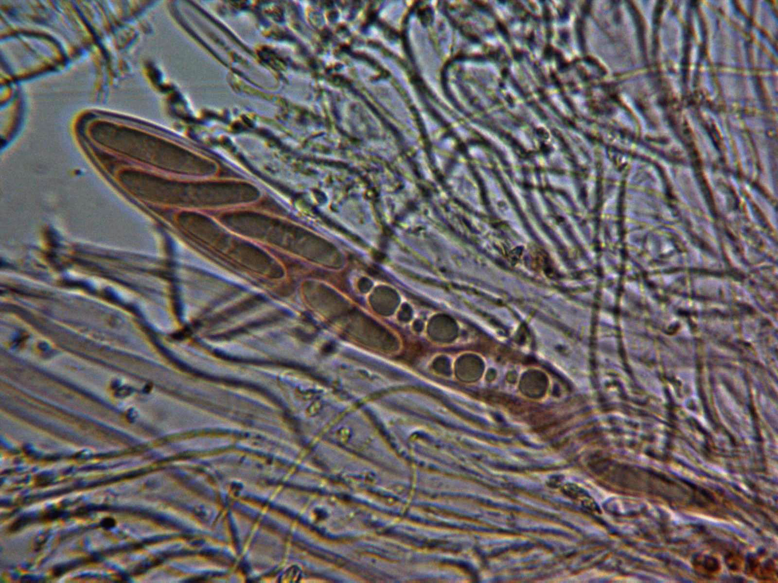 Esporas cilíndricas, alargadas, ligeramente alantoides, inamiloides al Melzer y con dos gútulas en su interior. Las medidas de estas de (21,8) 24,1;28,1 X (5,1) 6,3;7 micras.