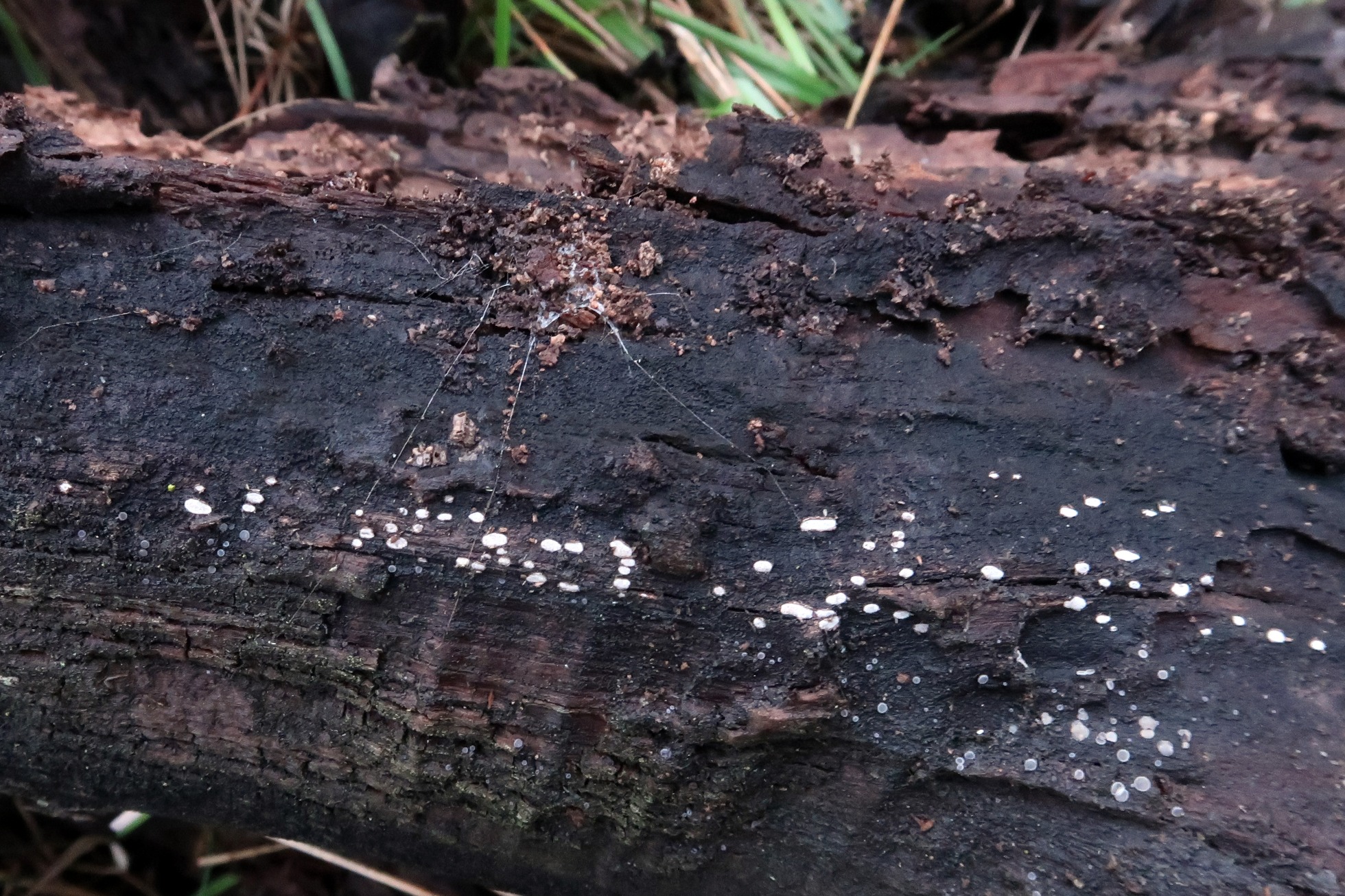 Pequeños carpóforos de color blanco, consistencia gelatinosa y aspecto harinoso. De muy pequeño tamaño, el mayor de apenas 4 mm. y formas irregulares entre elípticas y naviculares.