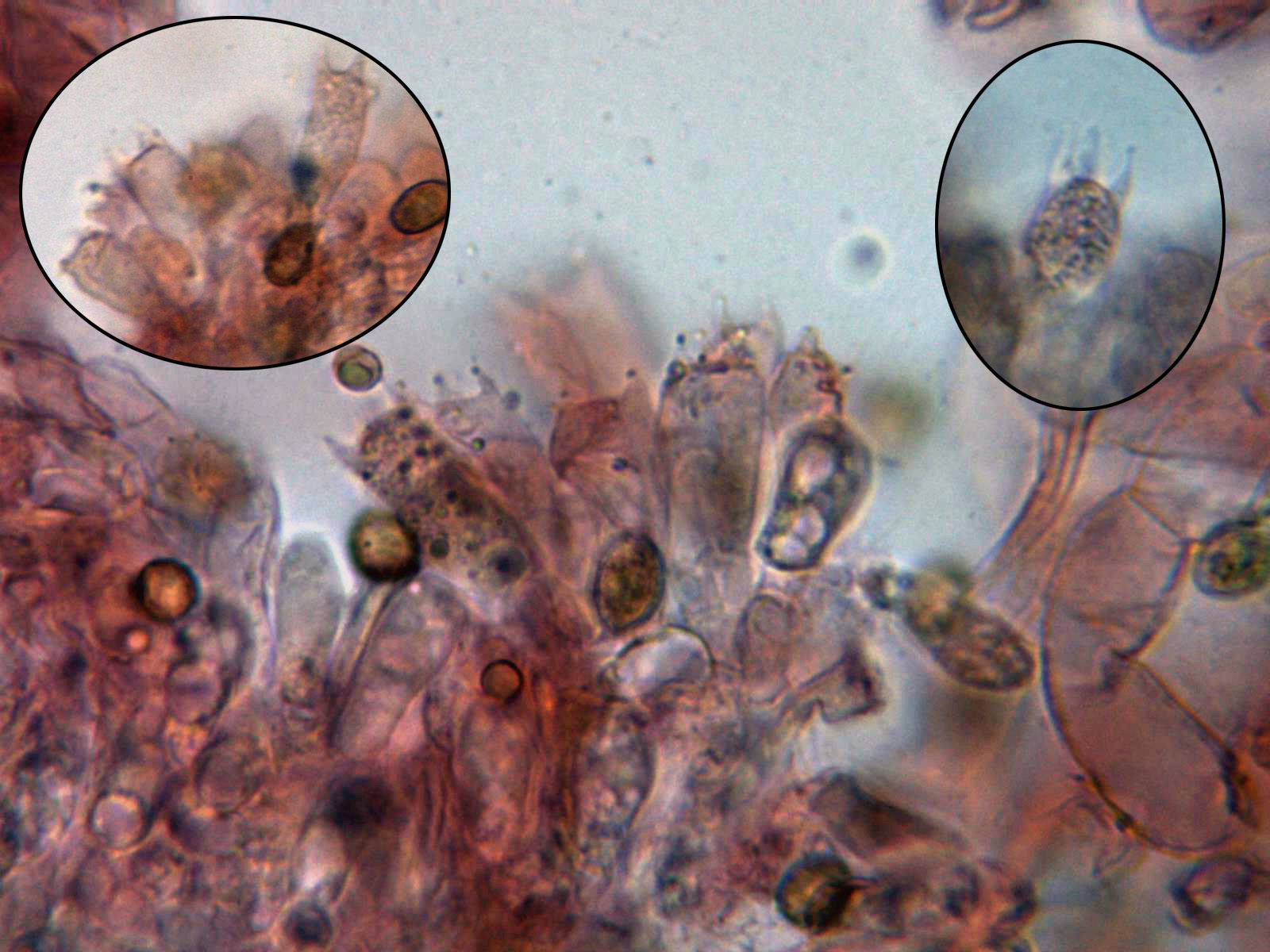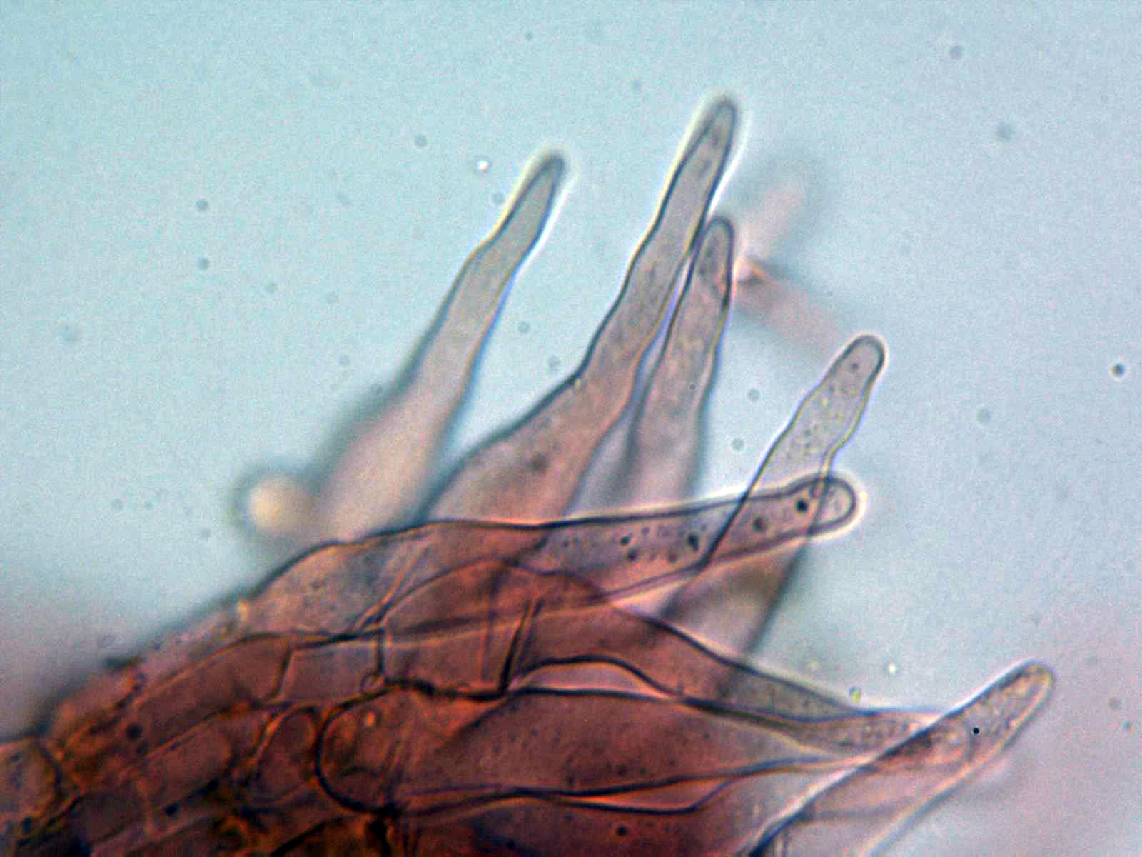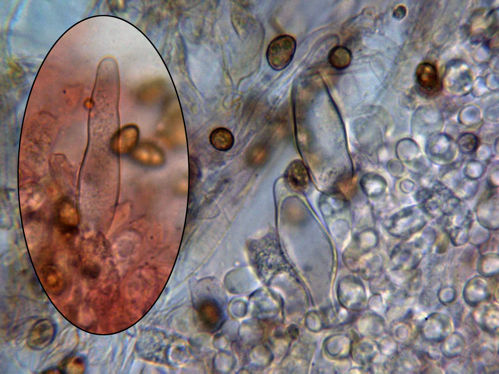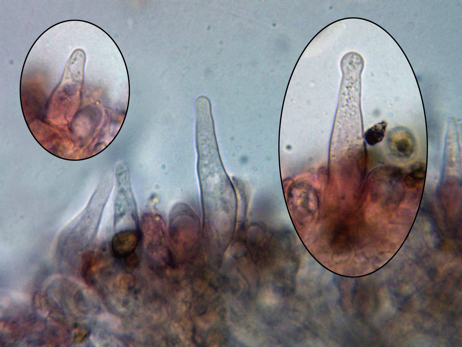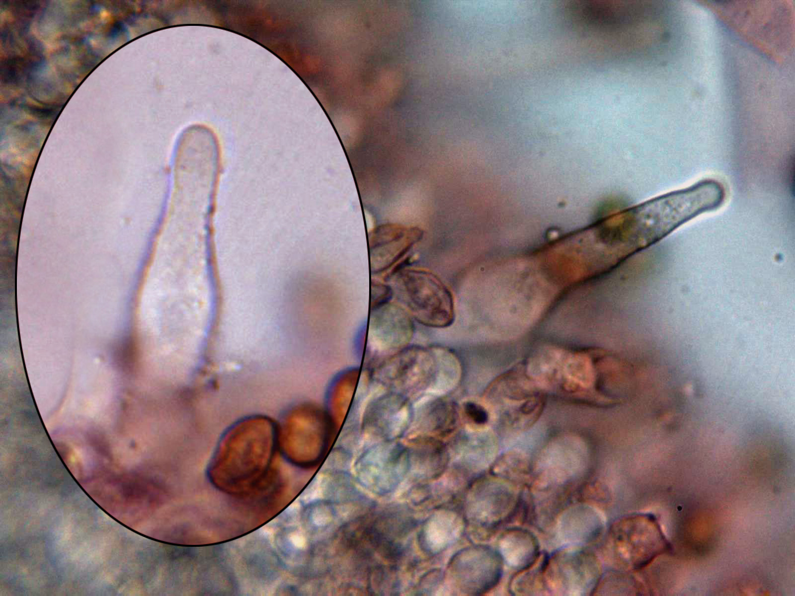Pleurocistidios cilíndricos, alargados, ventrudos en la base y terminando en formas redondseadas.