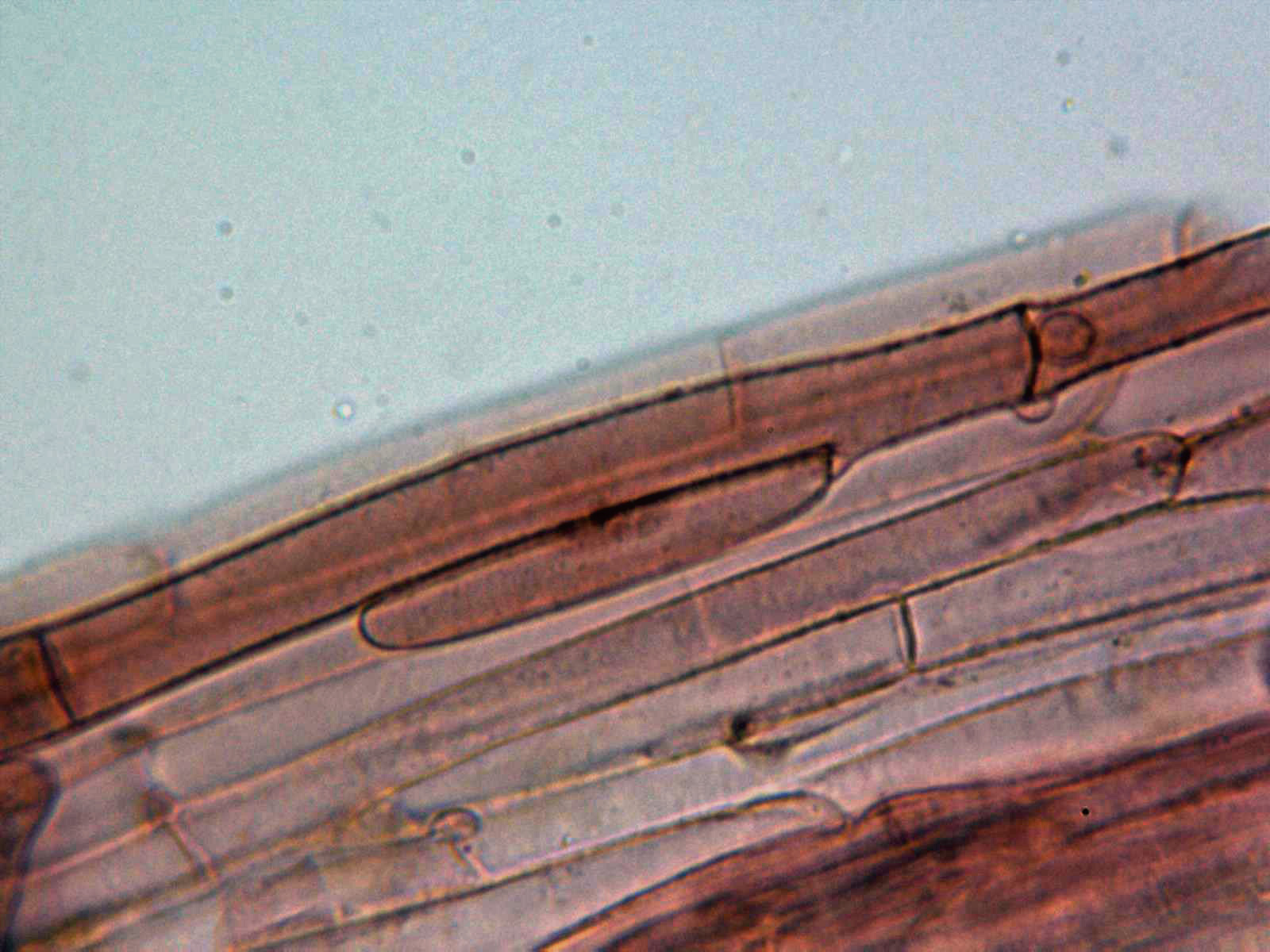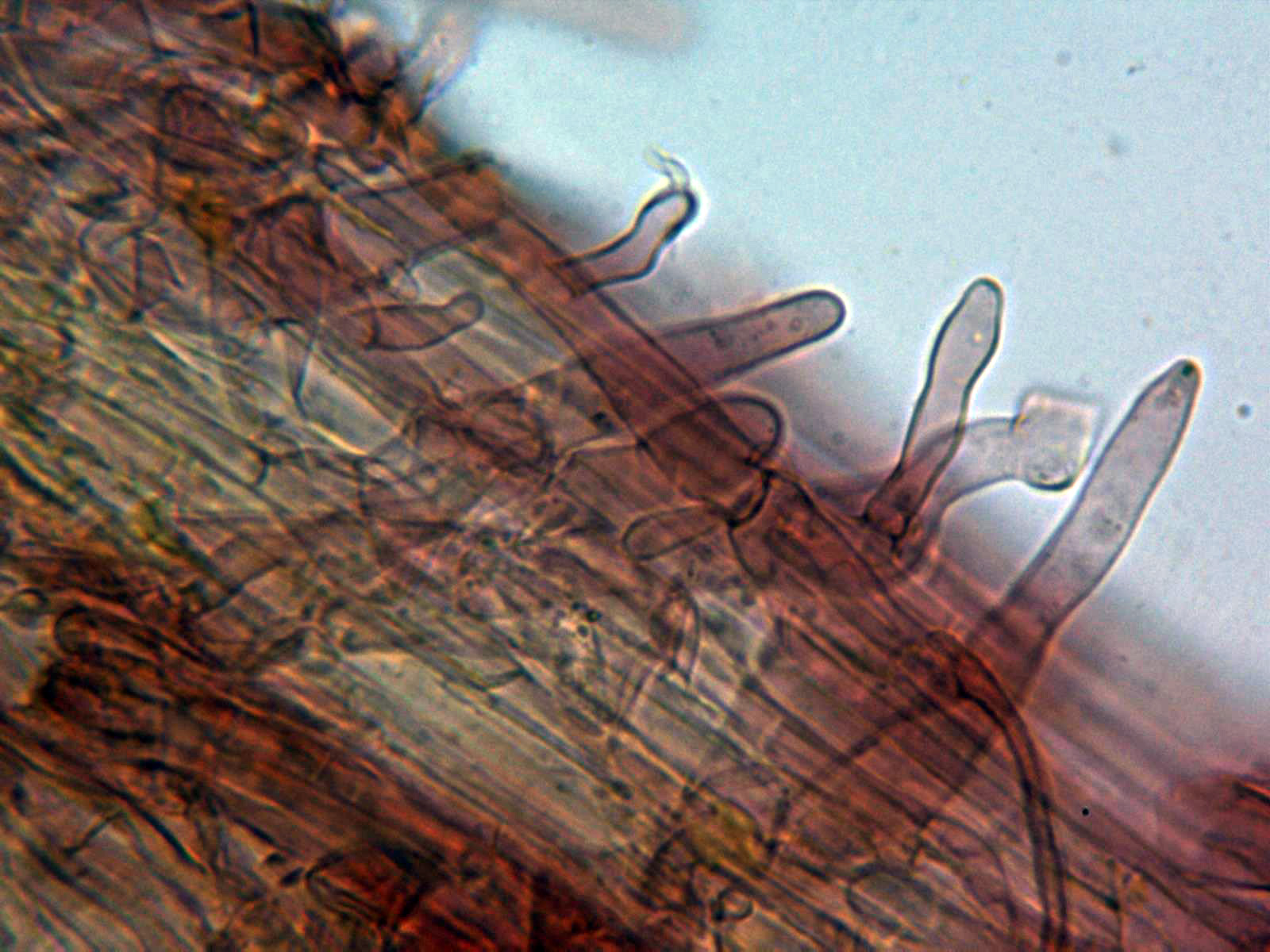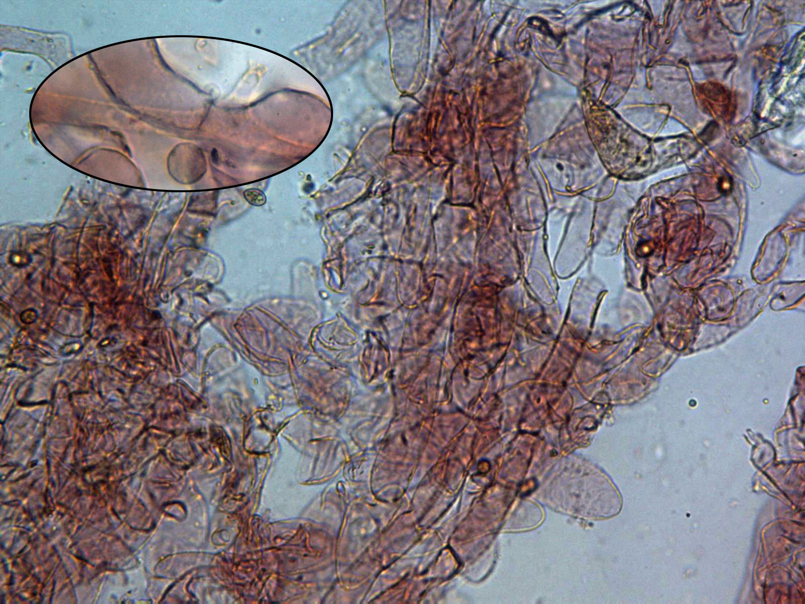 Pileipellis compuesta por hifas entremezcladas con una ligera pigmentación, me costó horrores el observar alguna fíbula tal y como citan los autores, en todo caso de pequeño tamaño como la de la imágen.